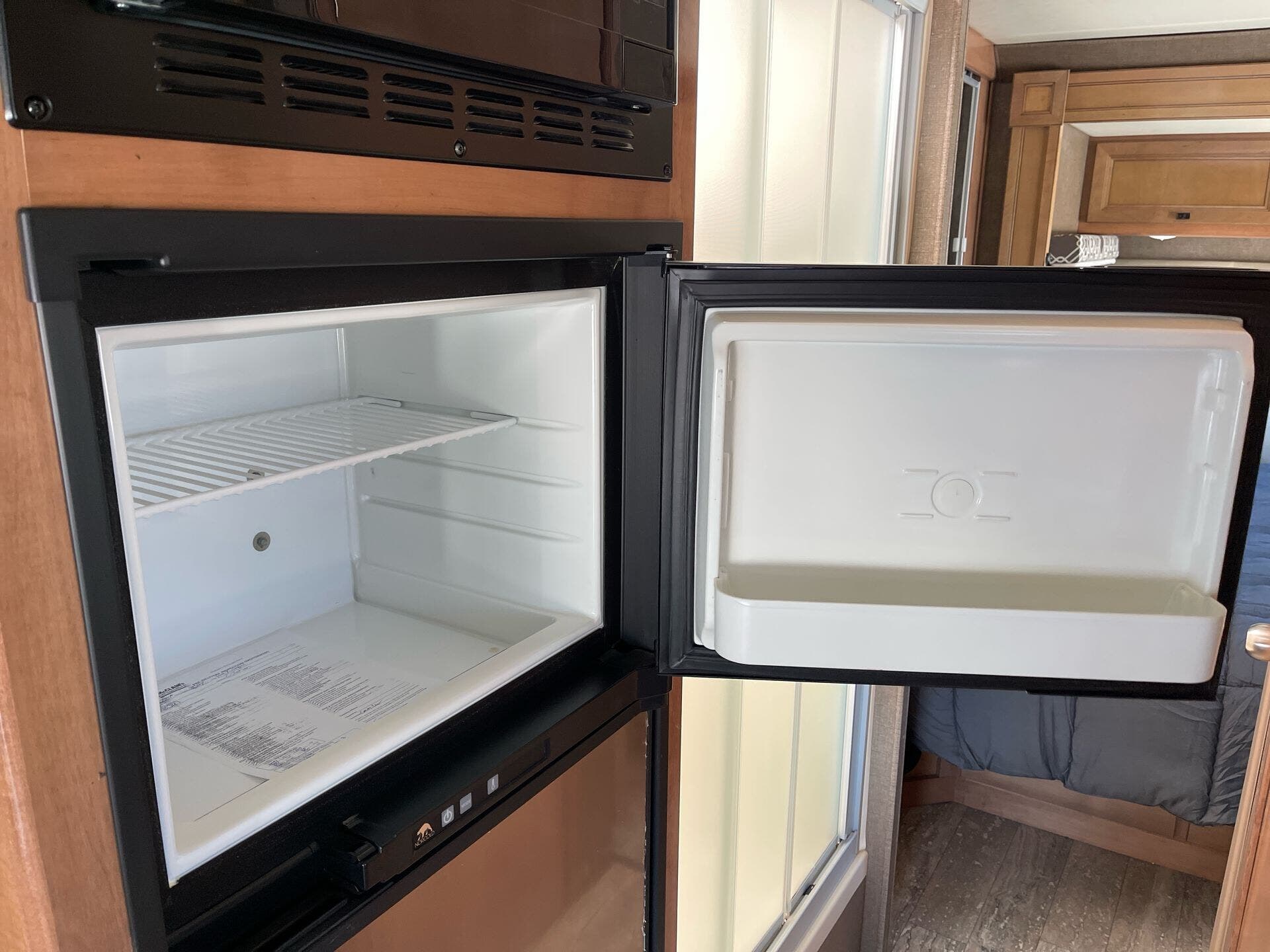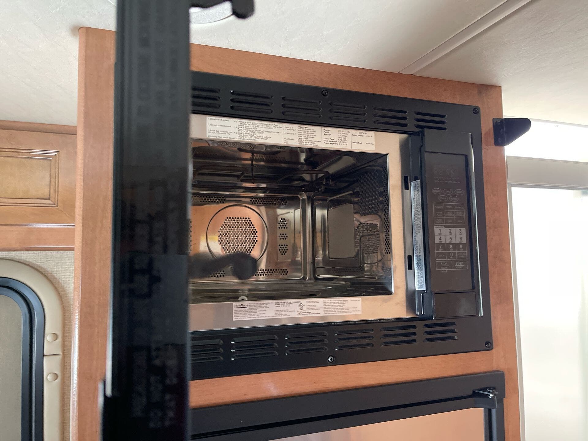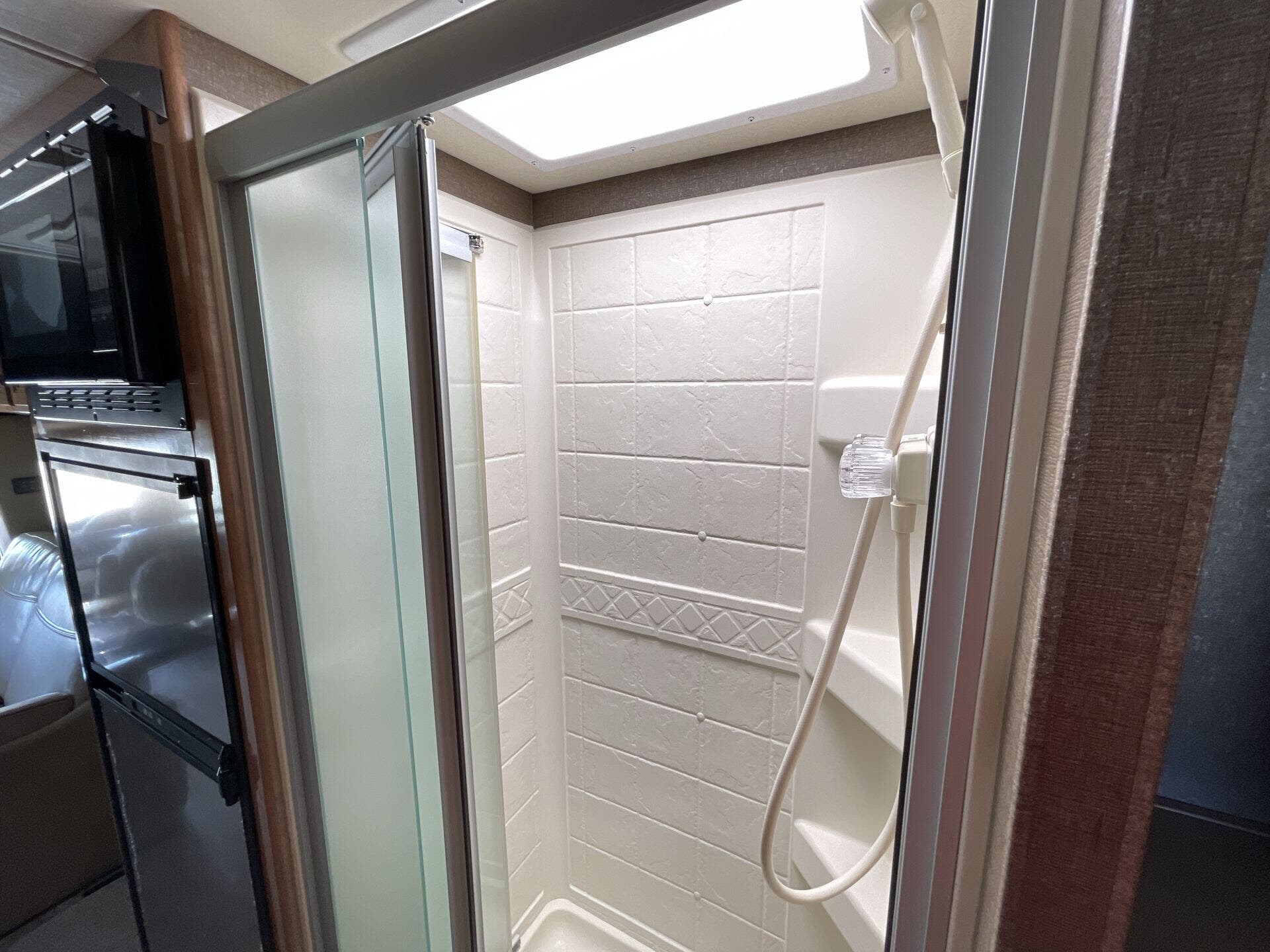 The kitchen is fully equipped with solid-surface countertops, a two-burner cooktop, convection microwave, and a refrigerator, providing everything needed for cooking on the road. A full bathroom with a shower, vanity, and toilet adds convenience and privacy.