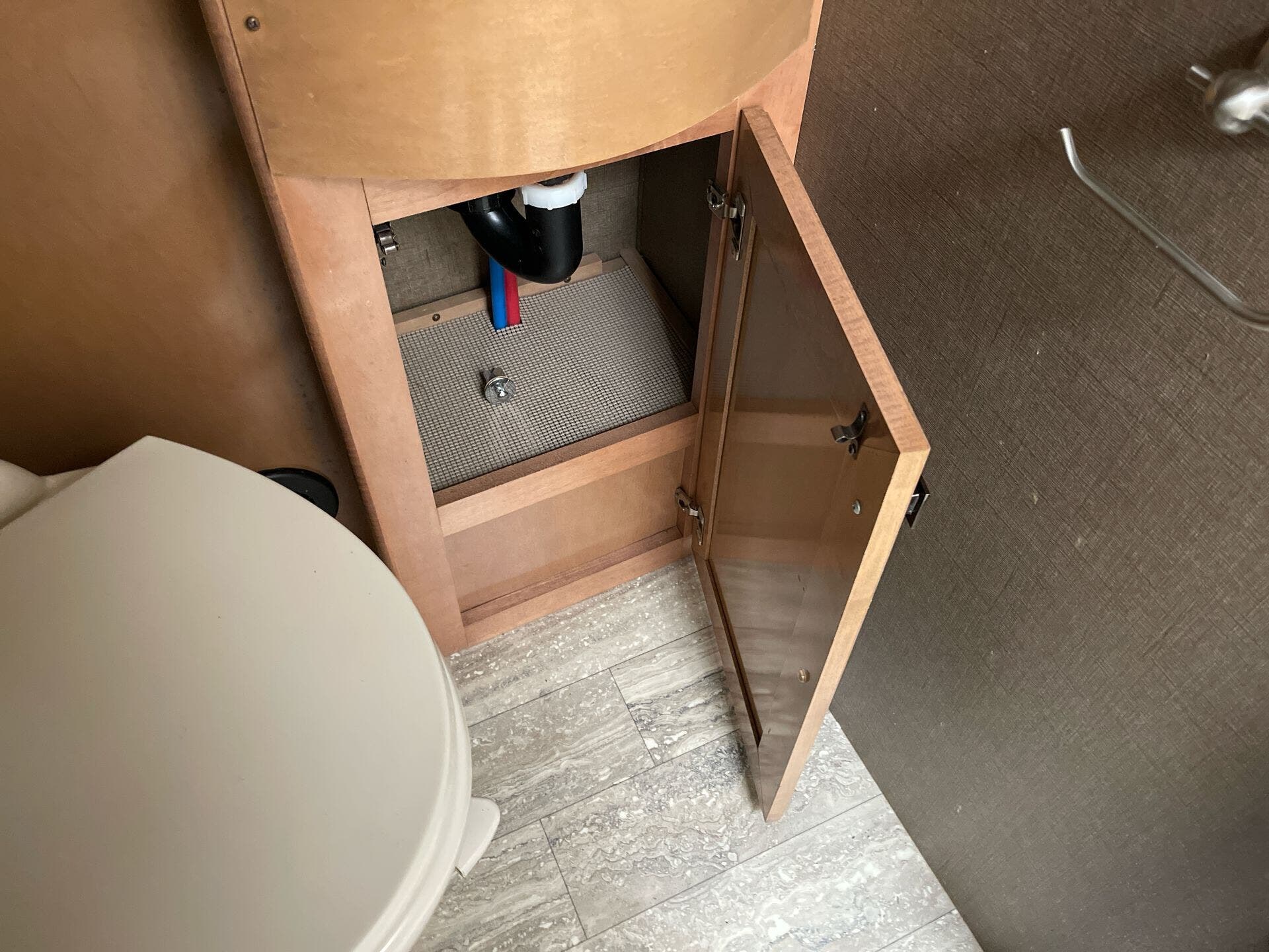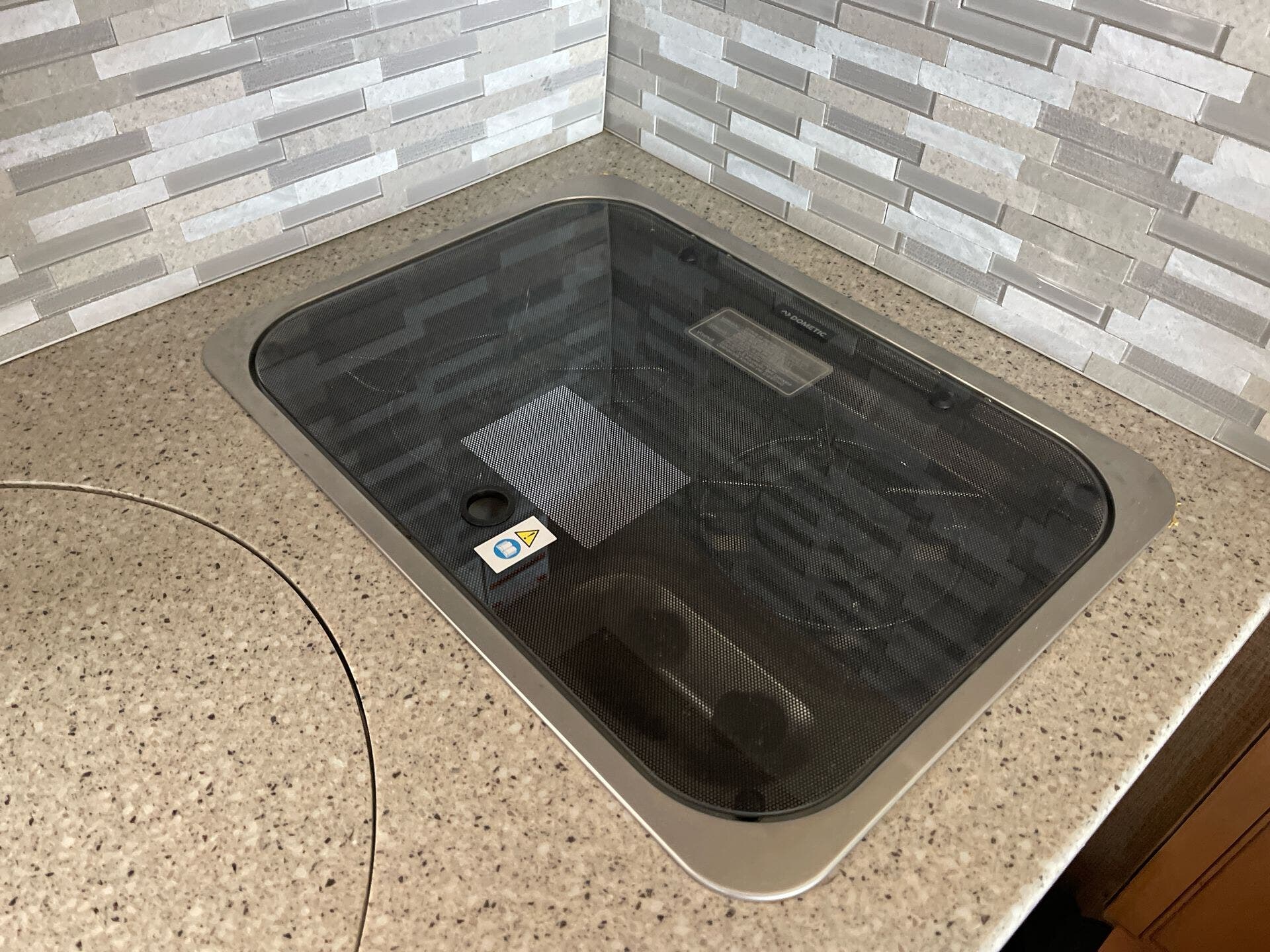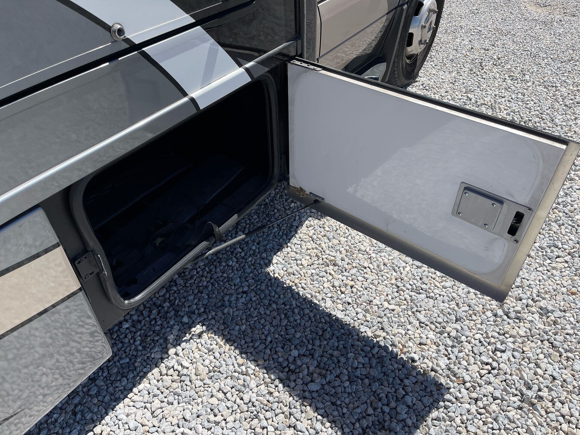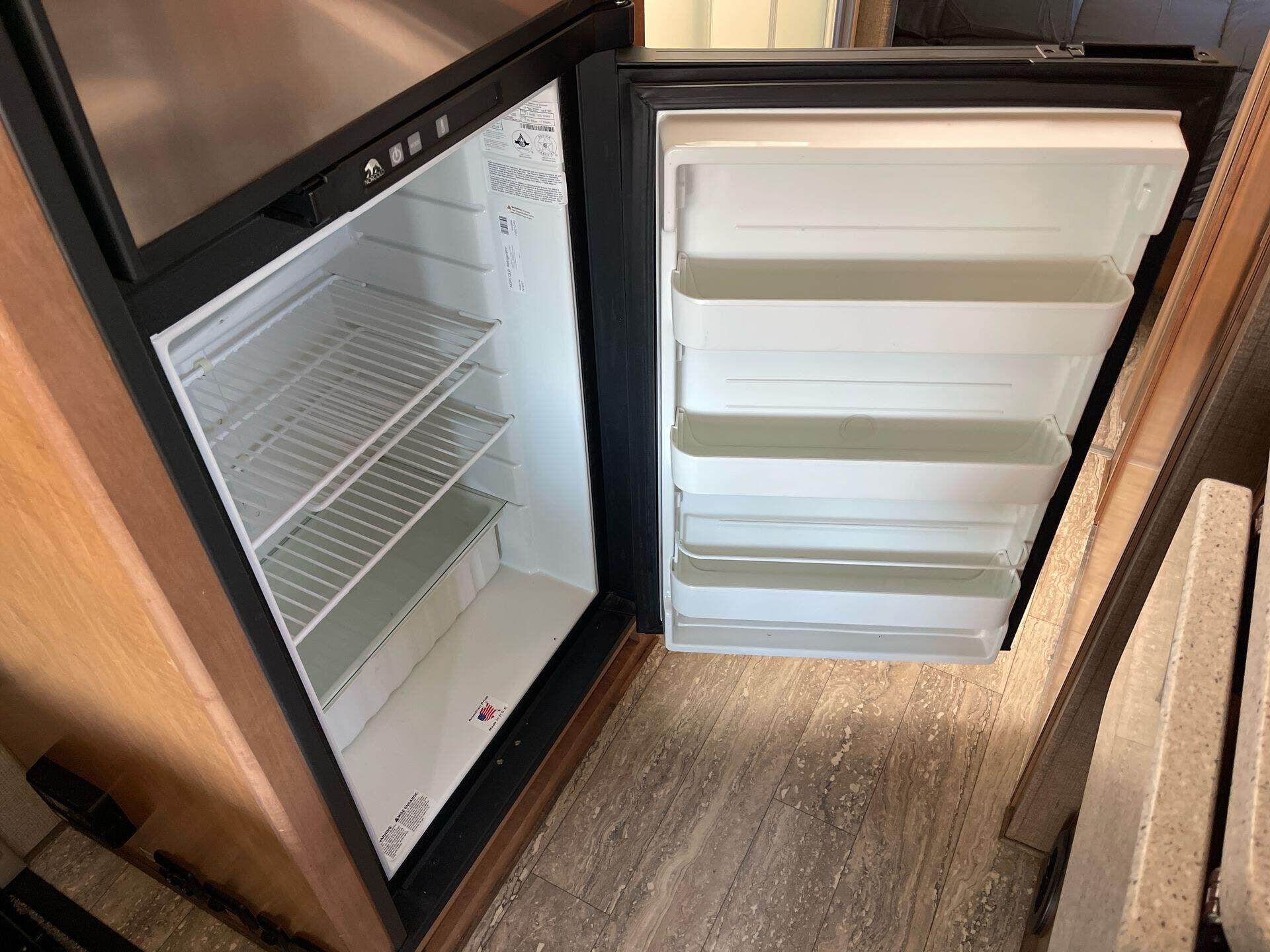 The kitchen is fully equipped with solid-surface countertops, a two-burner cooktop, convection microwave, and a refrigerator, providing everything needed for cooking on the road. A full bathroom with a shower, vanity, and toilet adds convenience and privacy.