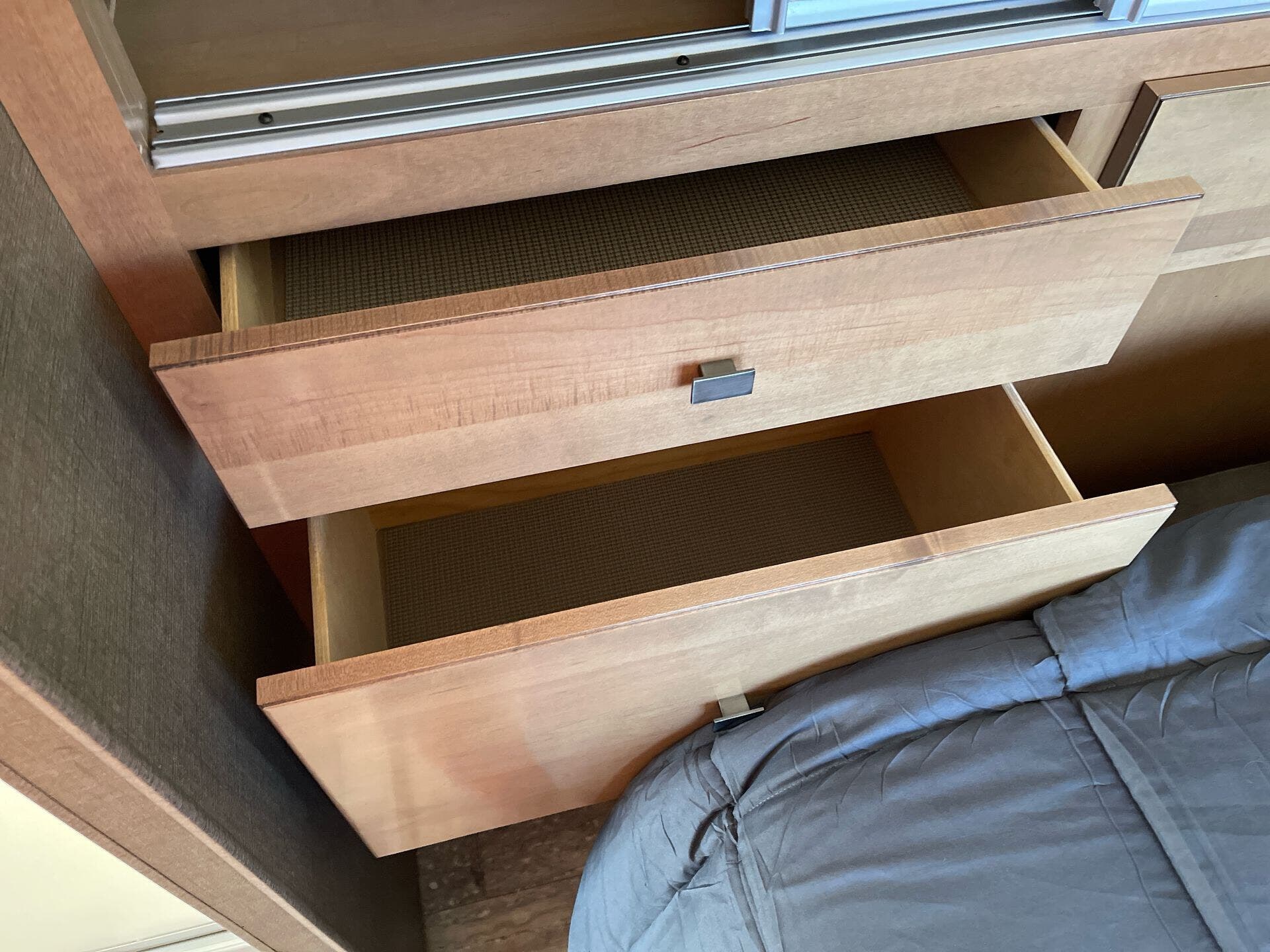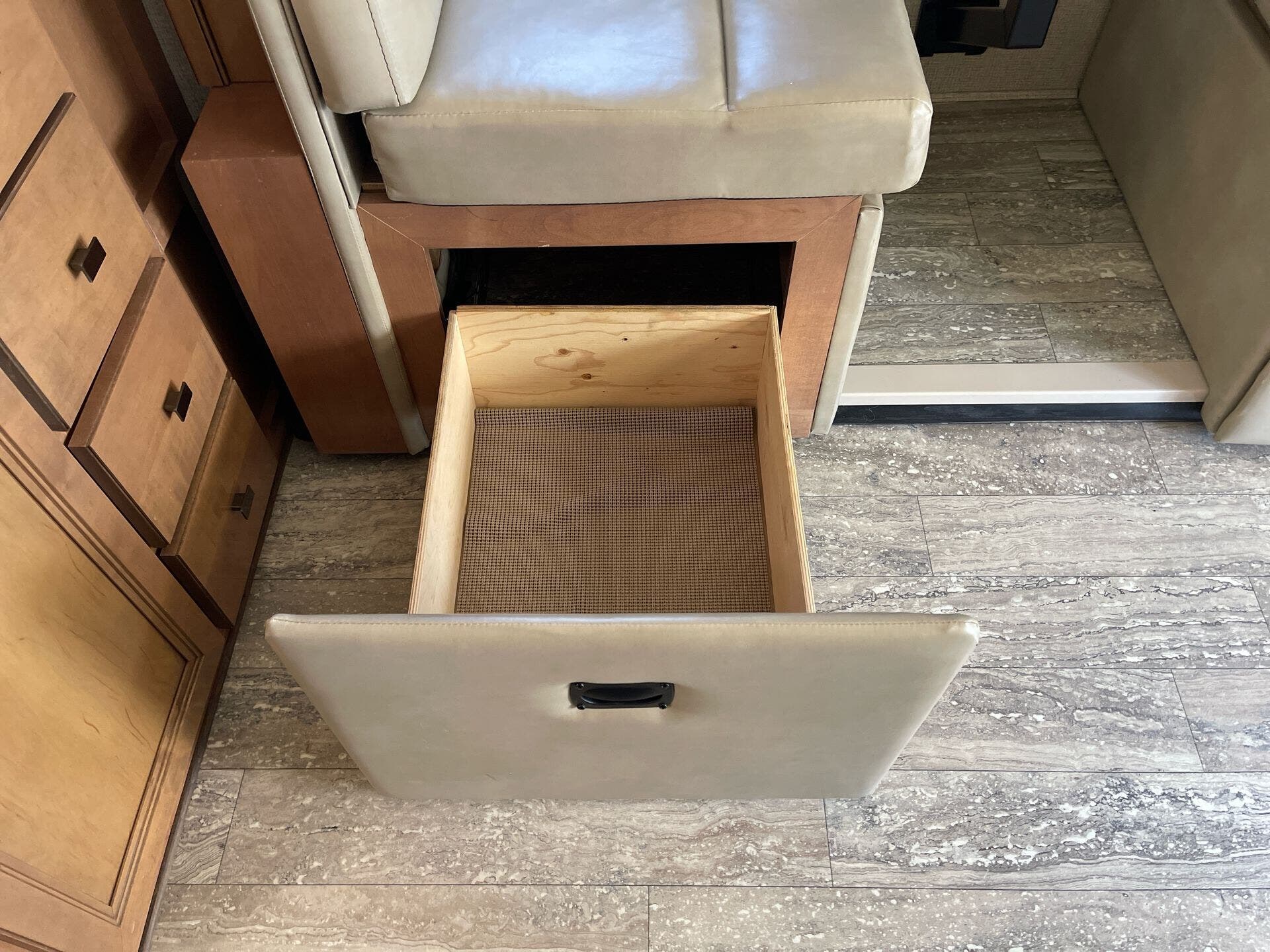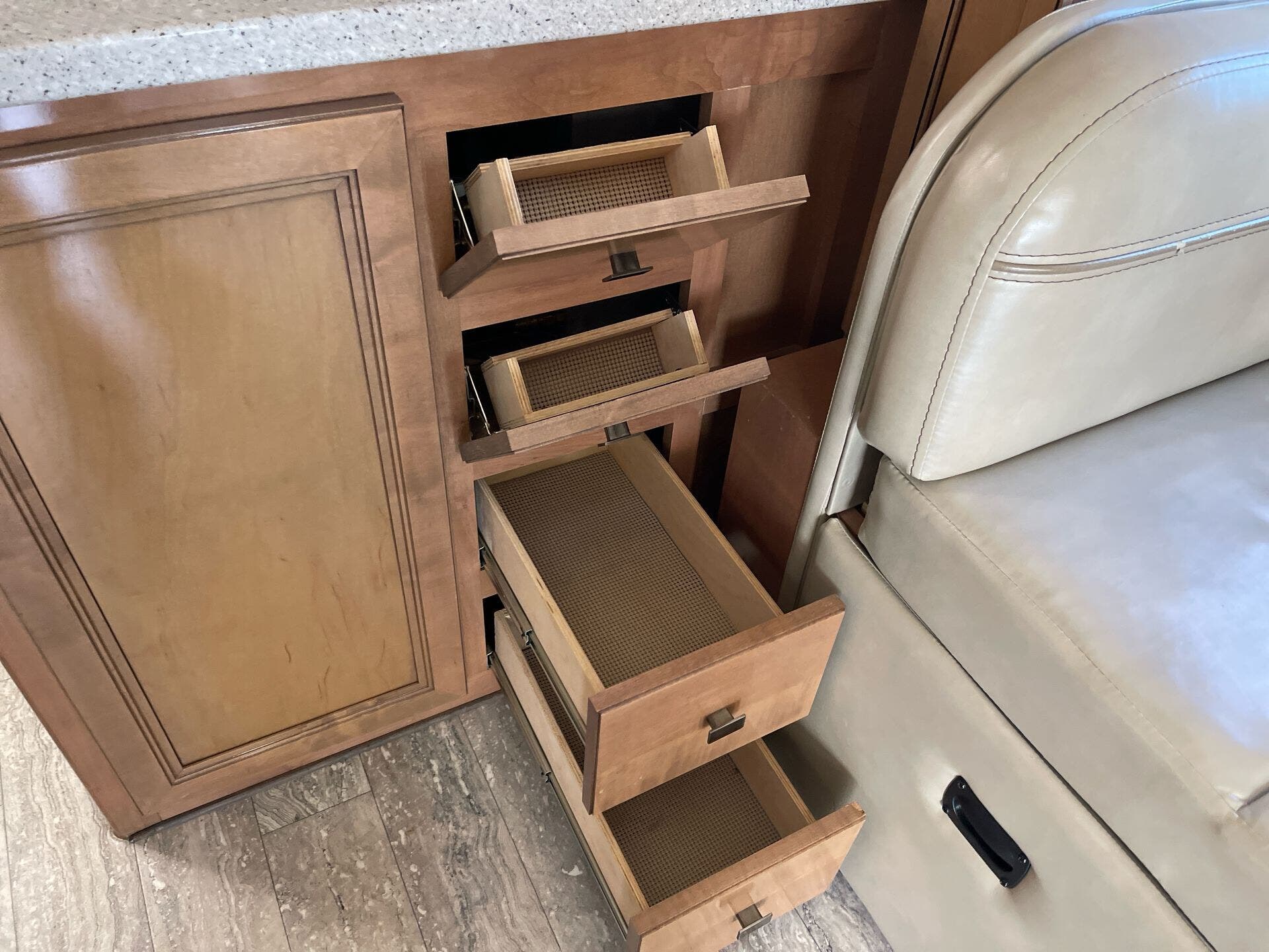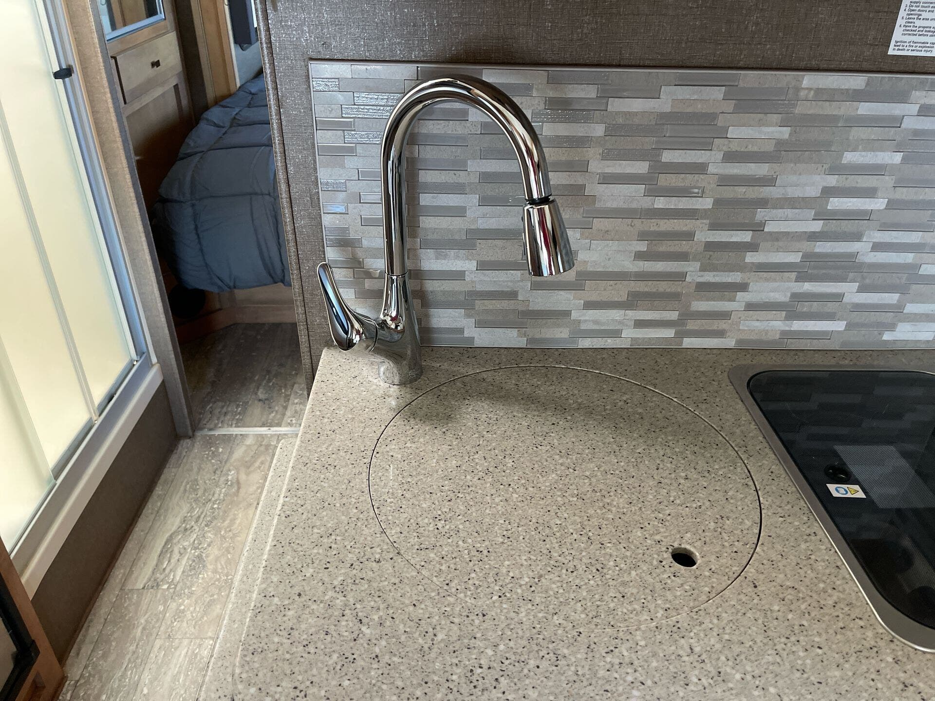 Measuring just over 24 feet in length, the 24SK features a smart floorplan with a full-wall slide that significantly expands the living space. Inside, you’ll find a comfortable Dream Dinette, a cab-over bunk for additional sleeping, and a rear sleeping area, allowing the coach to accommodate up to five people. The interior is finished with high-quality materials, modern cabinetry, and residential-style touches throughout.