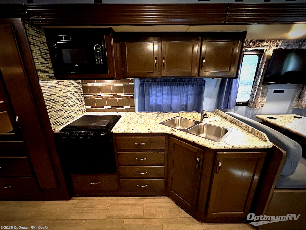 If you don't want anything holding you back while you see the country, then you need this Freedom Traveler Class A gas motorhome! You'll feel completely confident as you sit in the cab and use the back-up monitor to park at the campsite, and the reclining/swivel captain's chairs are not only helpful while you travel, but they are also great for relaxing once you've set up camp. The decorative backsplash and laminate countertops in the kitchen create a beautiful environment in which to cook dinner, and the stainless steel double-bowl sink with pull-down sprayer is extremely handy for cleaning up the mess from dinner.