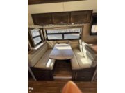 In the kitchen, the 33.1 offers practical features including a three-burner range with oven, an overhead microwave, a double-door refrigerator, and solid counter space for meal prep. Storage cabinets and overhead compartments provide plenty of space for cookware and pantry items. Right across from the kitchen is a dinette booth that also converts into an additional sleeping arrangement.