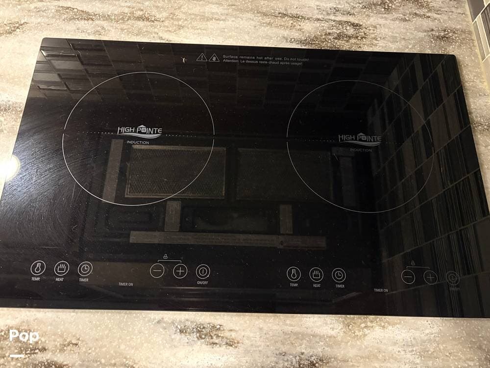 The kitchen includes a stainless steel refrigerator/freezer, electric induction stove, ice maker, double sink, and plenty of cabinetry.