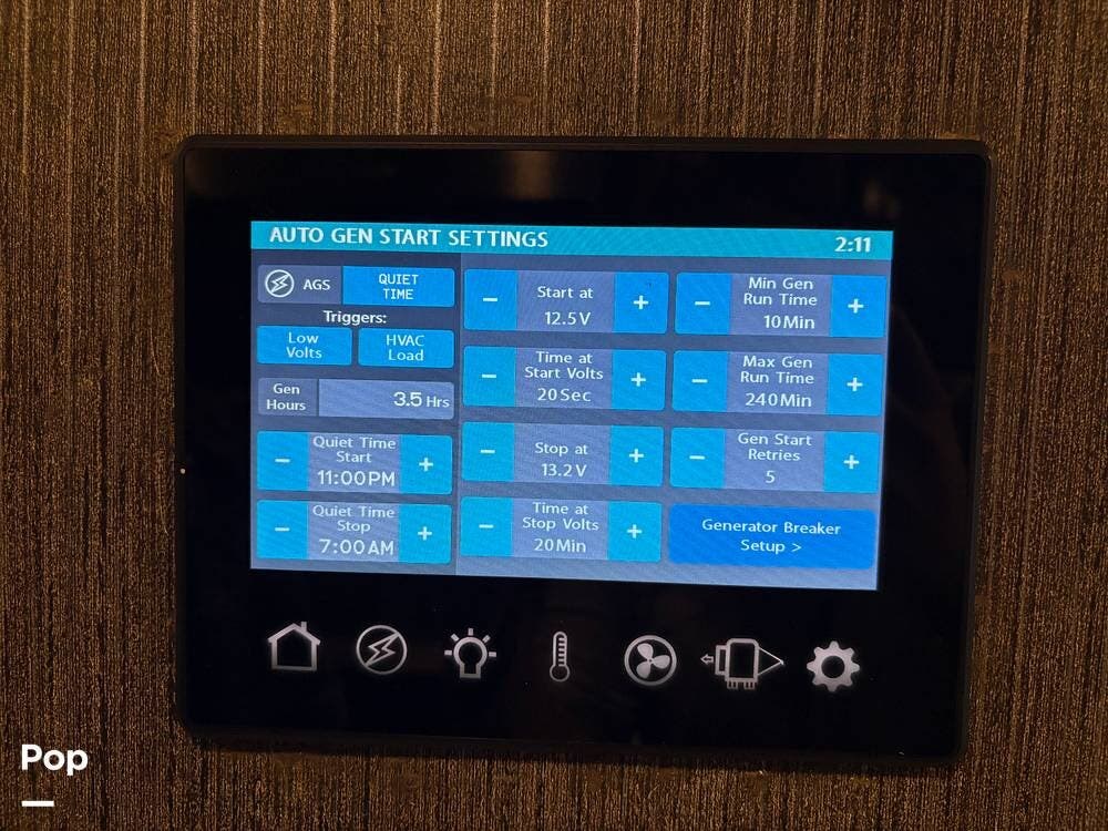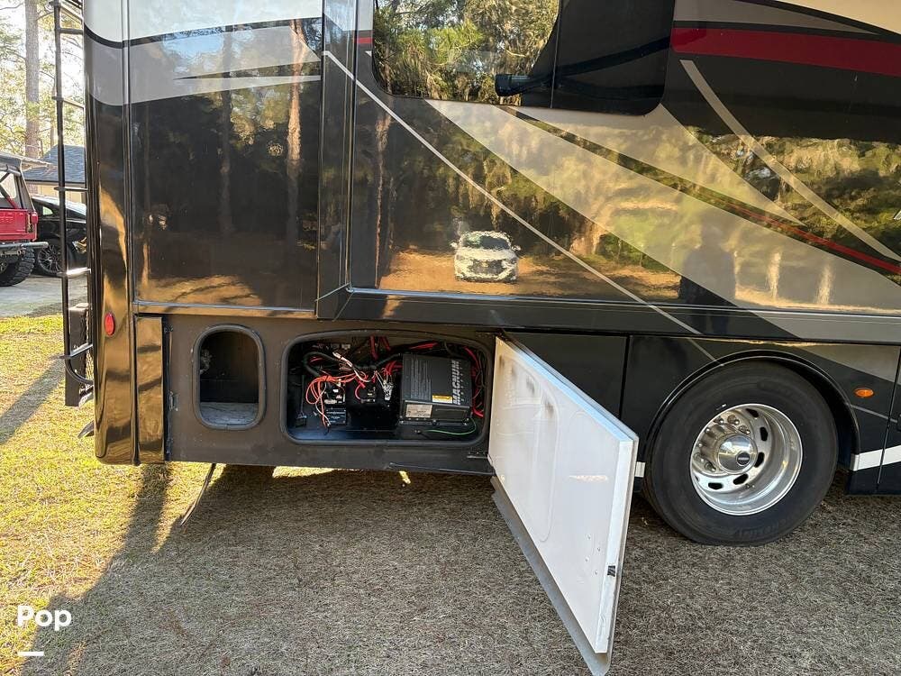 Safety and convenience features include a backup monitor, auto-start generator, side-view cameras, automatic leveling jacks, and a 2000-watt inverter with 100-watt solar charging.