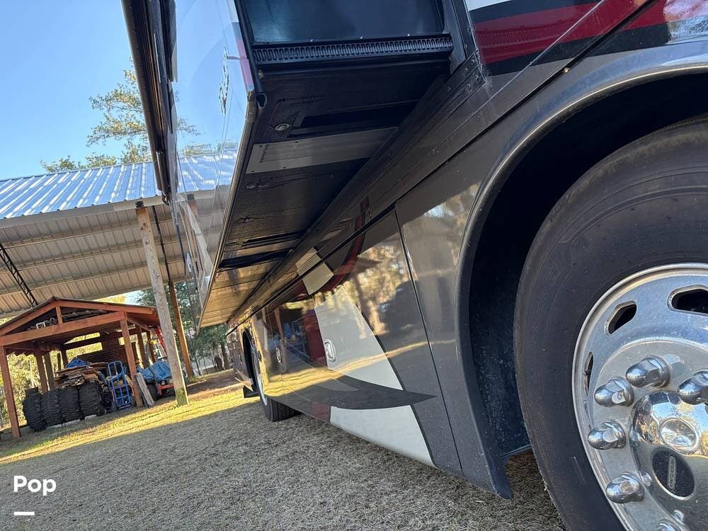 This coach sleeps six and features three slide-outs, theatre seating, a dinette sleeper, a Tilt-a-View king bed, and four TVs.