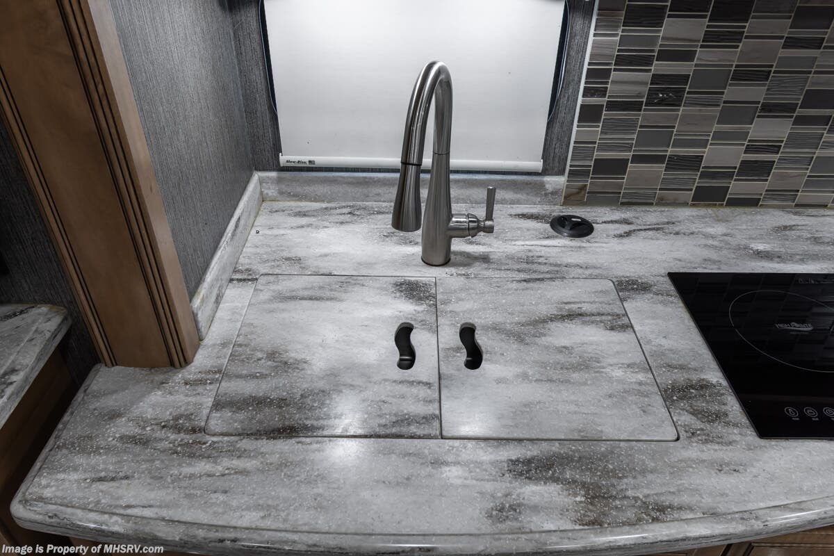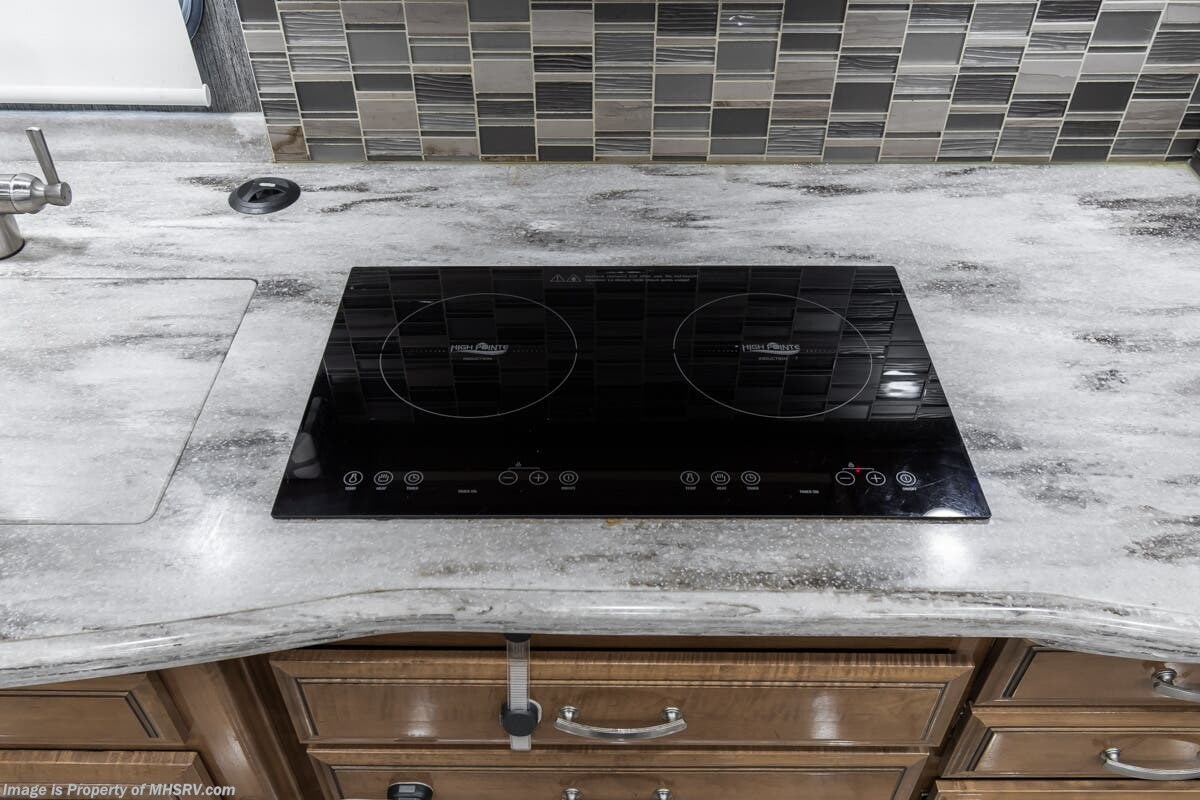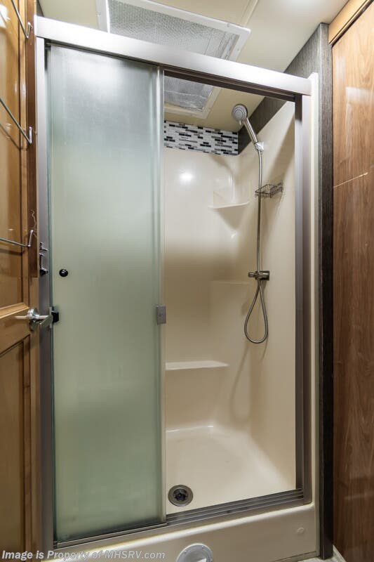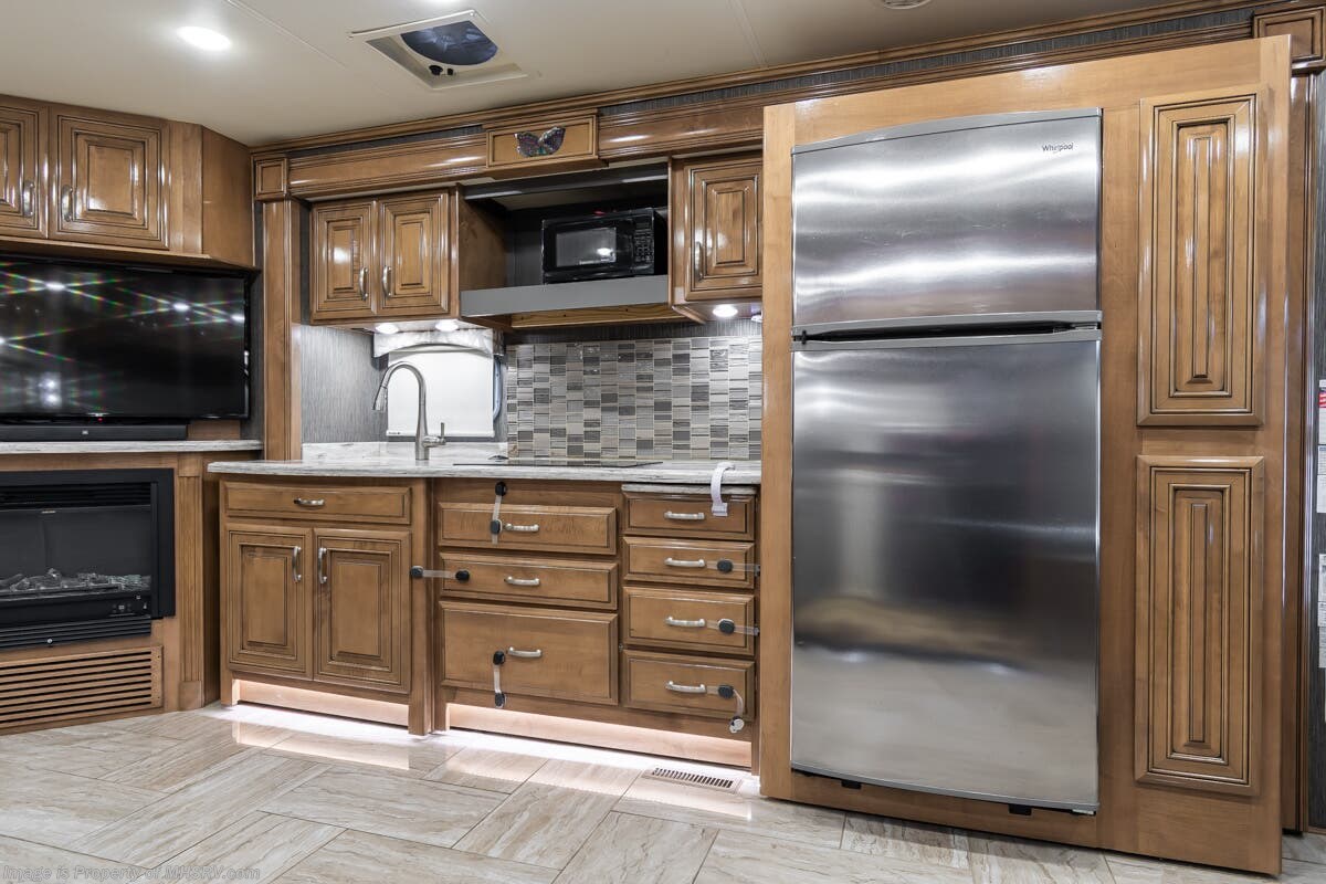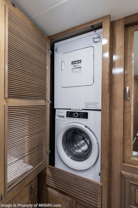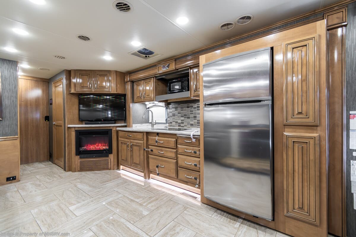 More About This RV This RV features hydraulic leveling system, aluminum wheels, full body paint, 3 camera system, dual A/Cs, Satellite dish, Diesel generator, Cummins 360HP diesel engine, Freightliner chassis, tilt/telescoping steering wheel, secondary exhaust brake, power visor, patio awning, door awning, cargo tray, pass through storage, LED running lights, docking lights, black tank flush, water filtration system, exterior shower, exterior TV, clear paint mask, ladder, solar, inverter, air ride, ceramic tile, stackable washer/dryer, 7 foot ceiling, fireplace, hardwood cabinets, residential refigerator with ice maker, king bed, solid surface counters and much more