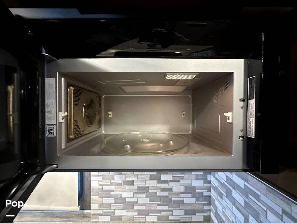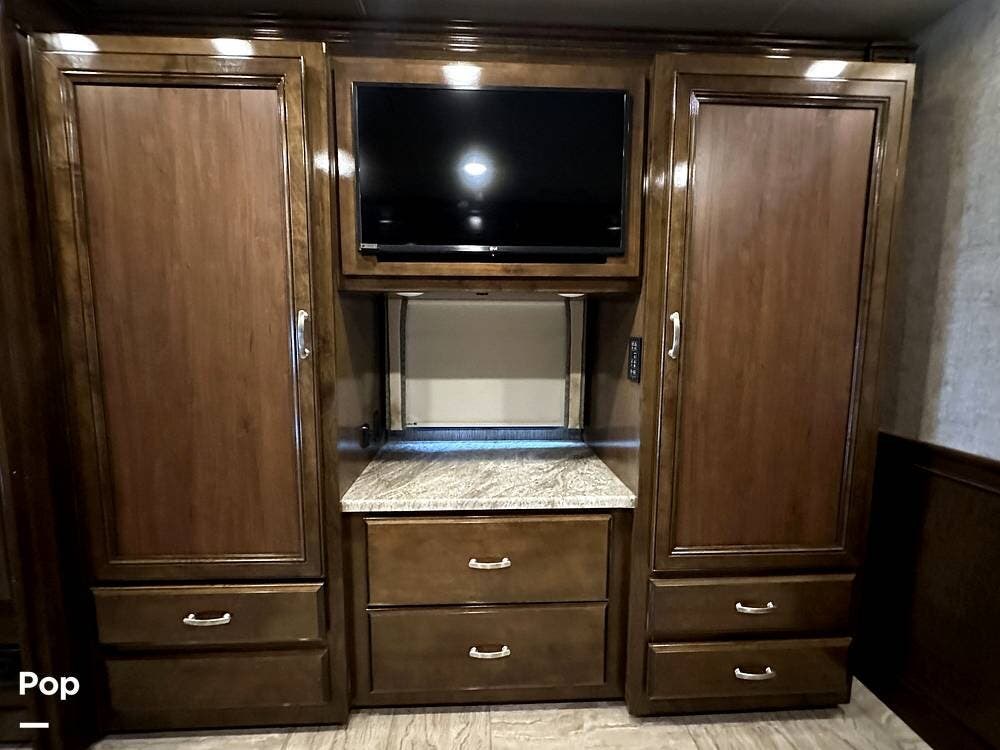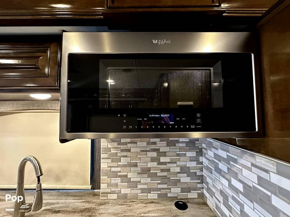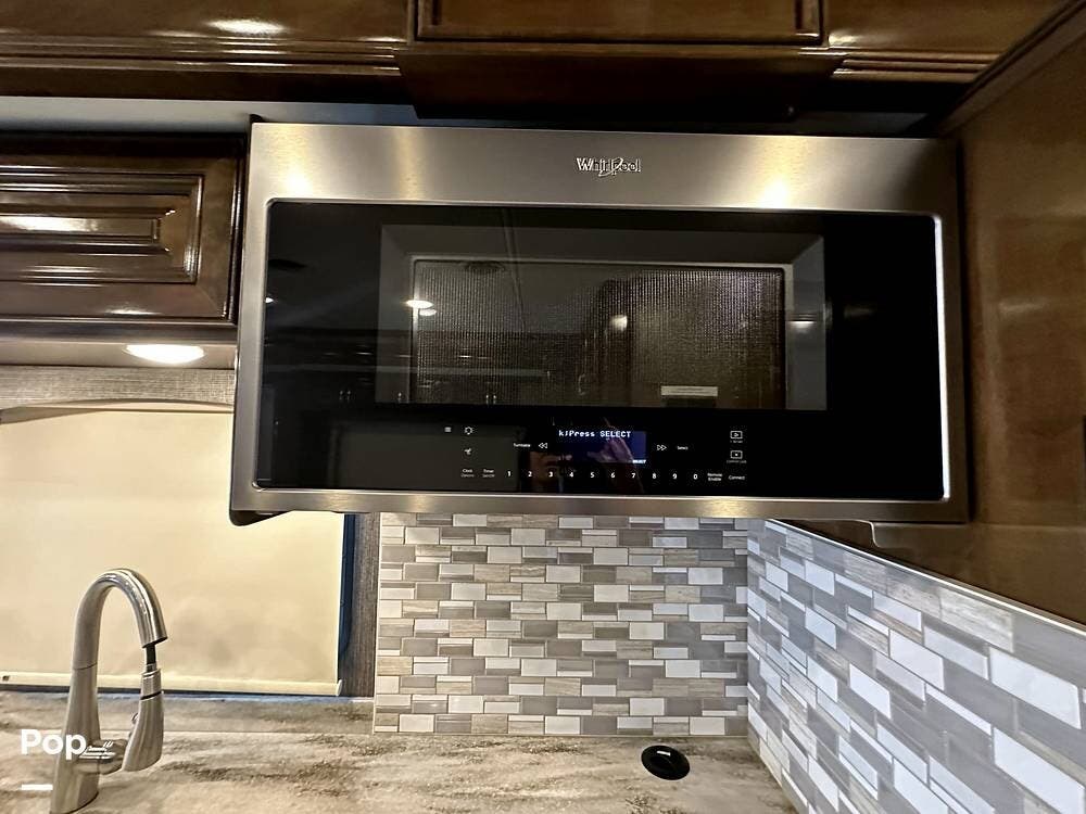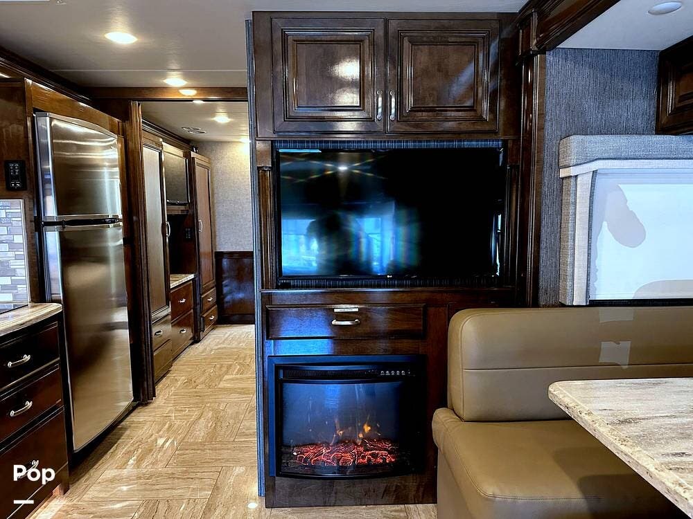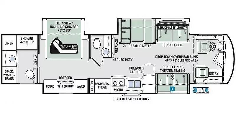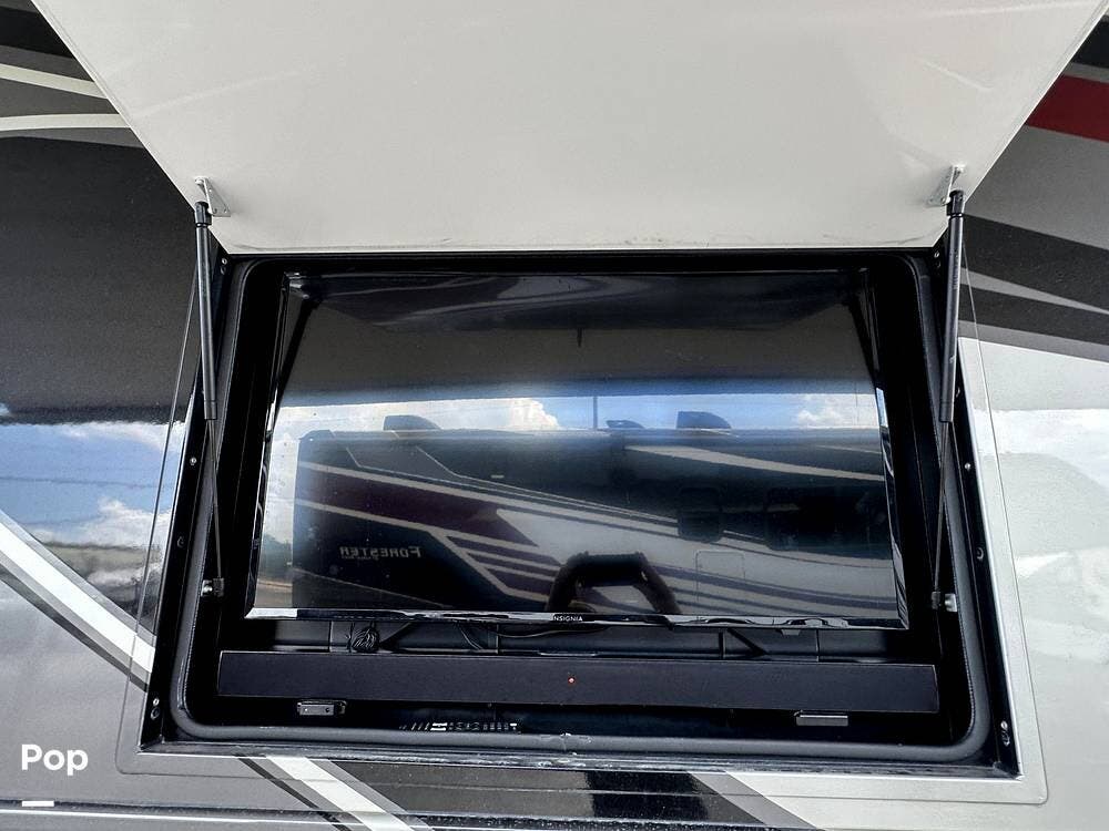 For entertainment, the living area features a 43" LED HDTV, a retractable 55" LED HDTV, a JBL Soundbar, a Sony Blu-ray player, and an electric fireplace. The RV also features a Winegard Connect 4 G/Wi-Fi option, but you must establish an account for this service.