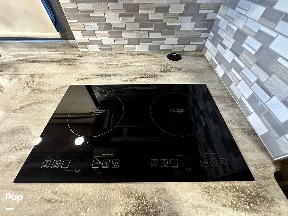 The kitchen stainless steel appliances include a residential refrigerator with an ice maker, an electric induction cooktop, and a designer tile backsplash. There is also a 1.9 cu ft. over-the-range convection microwave oven and solid-surface countertops. To complete the presentation, there is a large double-bowl stainless steel sink with a single-handled faucet and pull-down sprayer, as well as pop-up outlets in the kitchen counters.