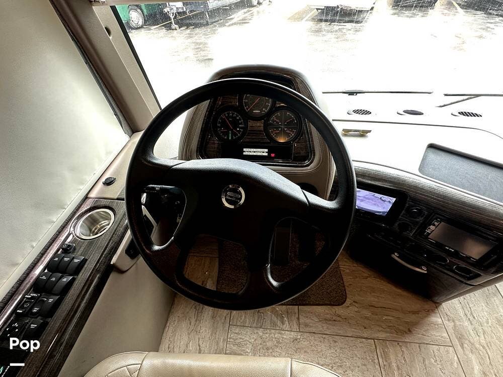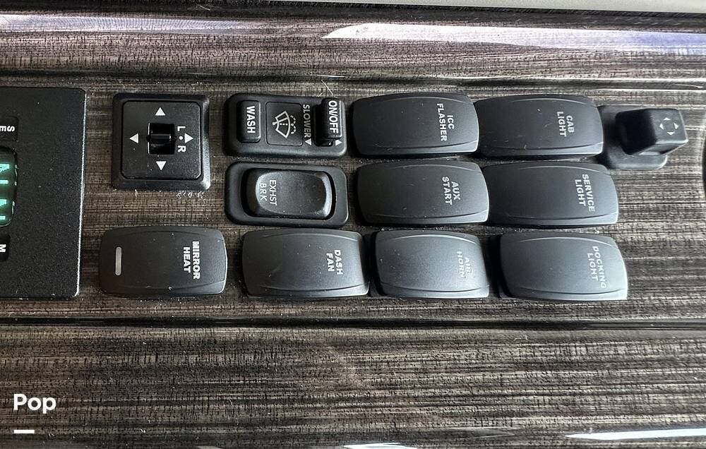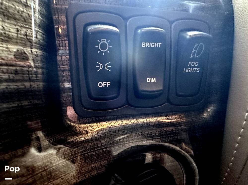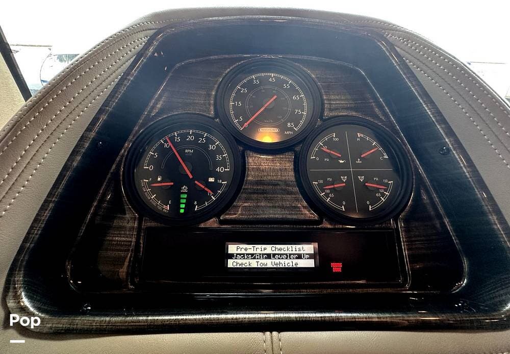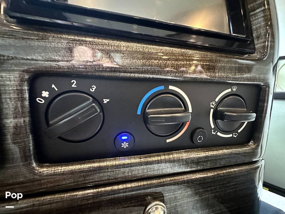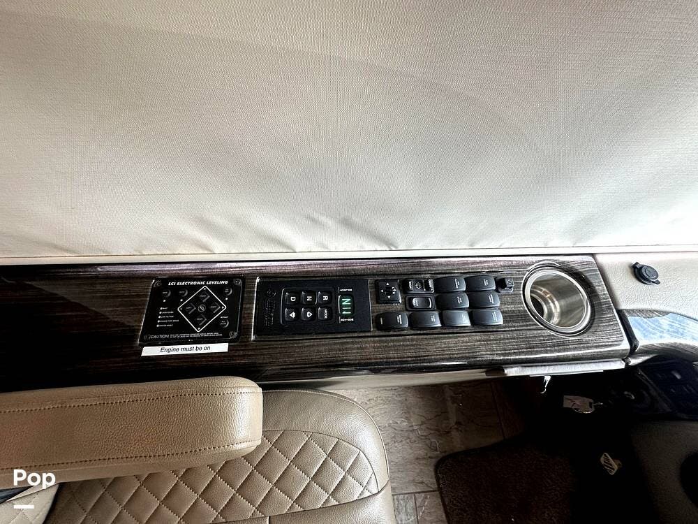 The Cockpit boasts a Tilt/Telescoping Steering Column with cruise control, Automatic Leveling Jacks with Touchpad Controls, an emergency engine start switch, map lights, dash fans, air horns, fog lights, and Leatherette reclining/swivel power-adjustable captain's Chairs. The passenger Captain's Chair has an electric footrest.