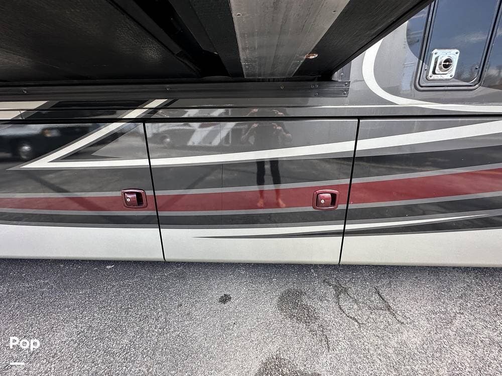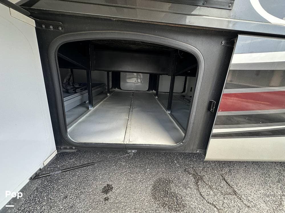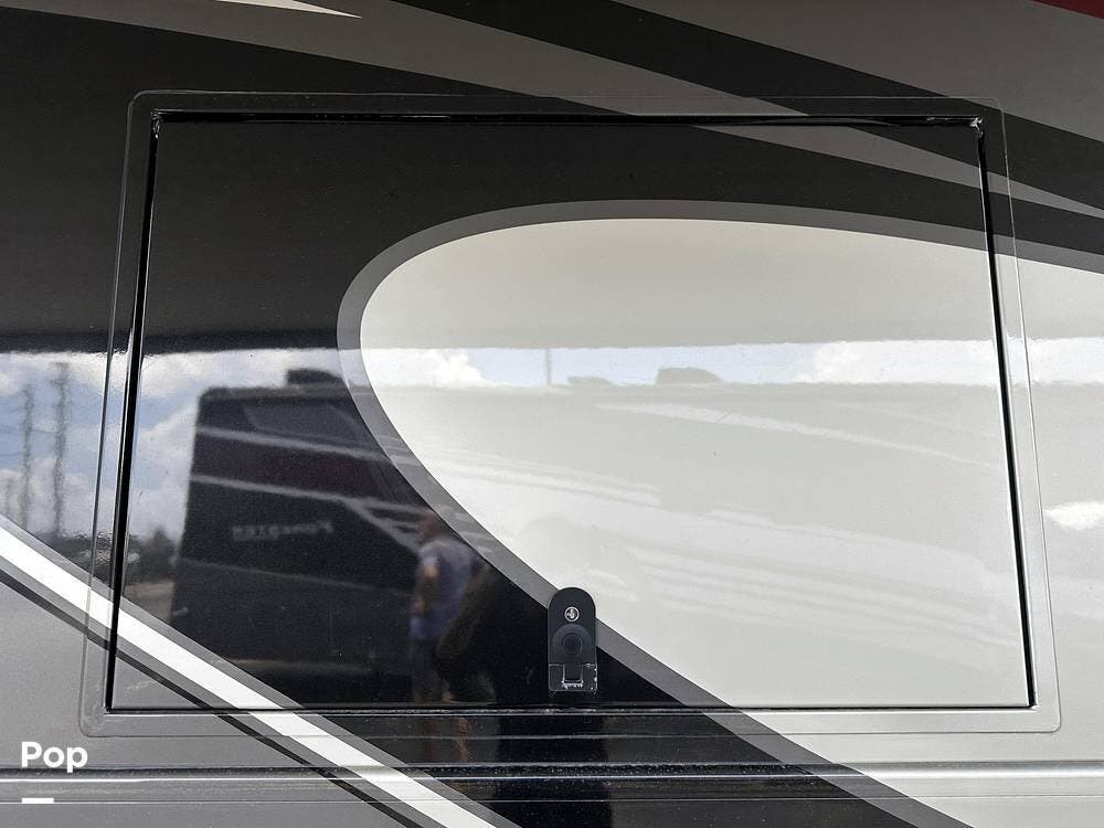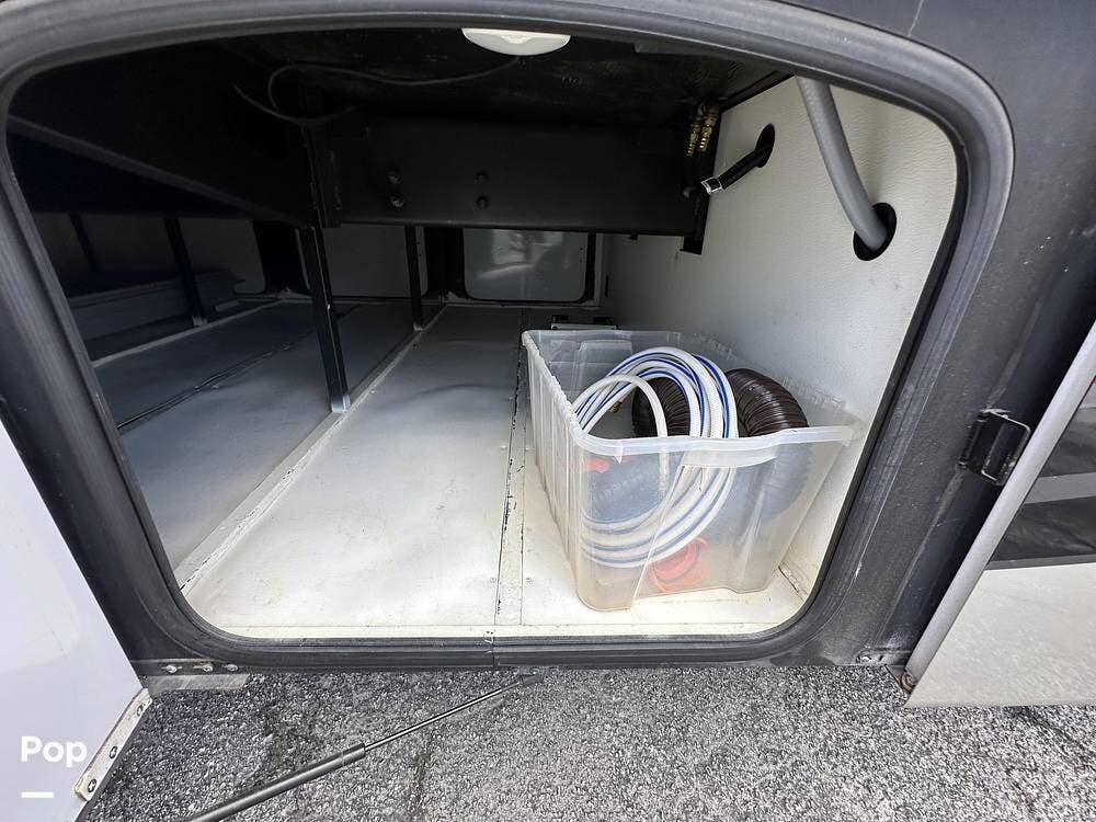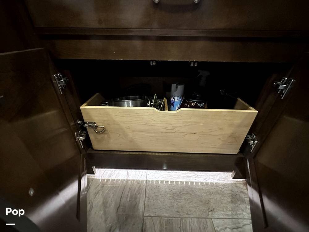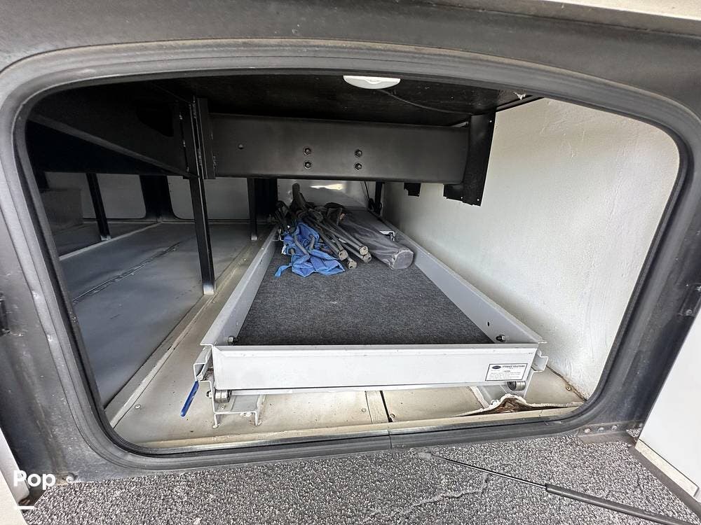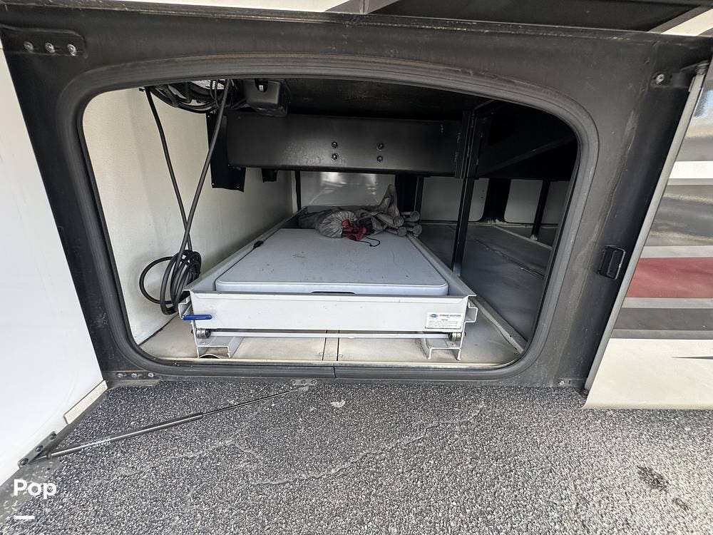 There is abundant exterior storage with side-hinged locking compartment doors, side-basement pass-through storage, and easy slide storage tray.