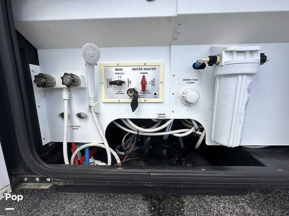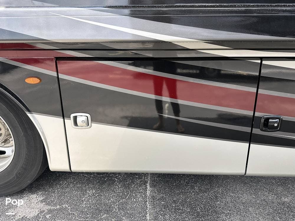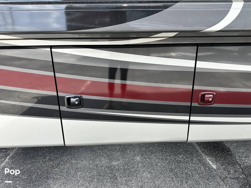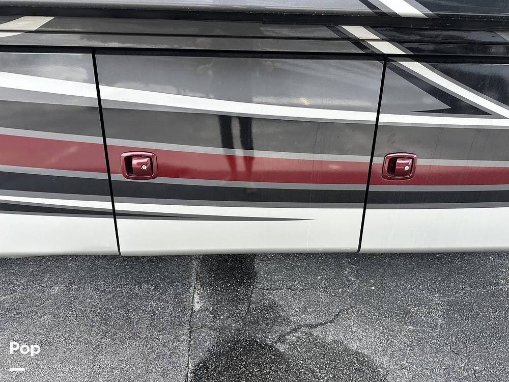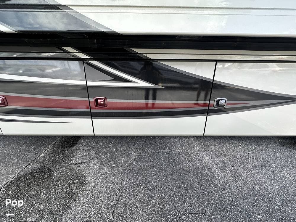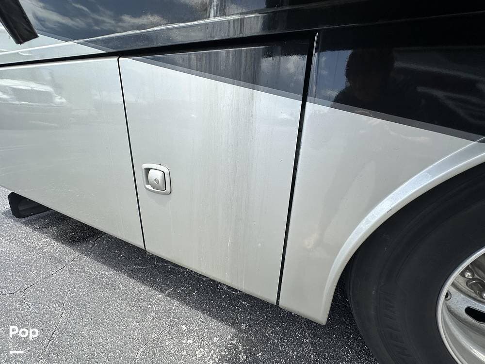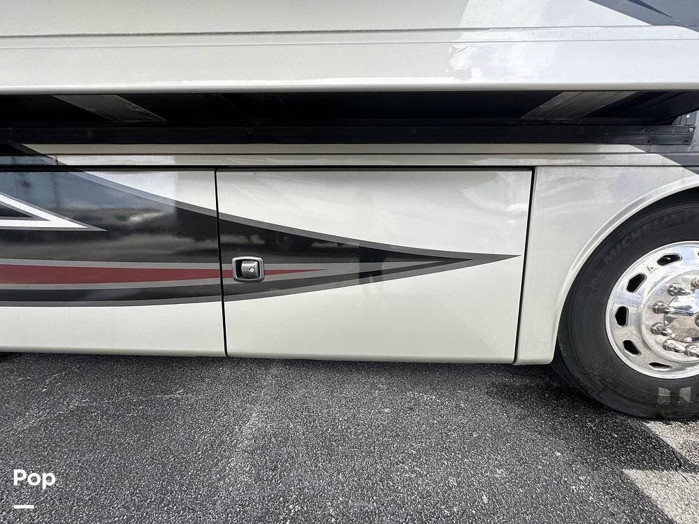 There is abundant exterior storage with side-hinged locking compartment doors, side-basement pass-through storage, and easy slide storage tray.