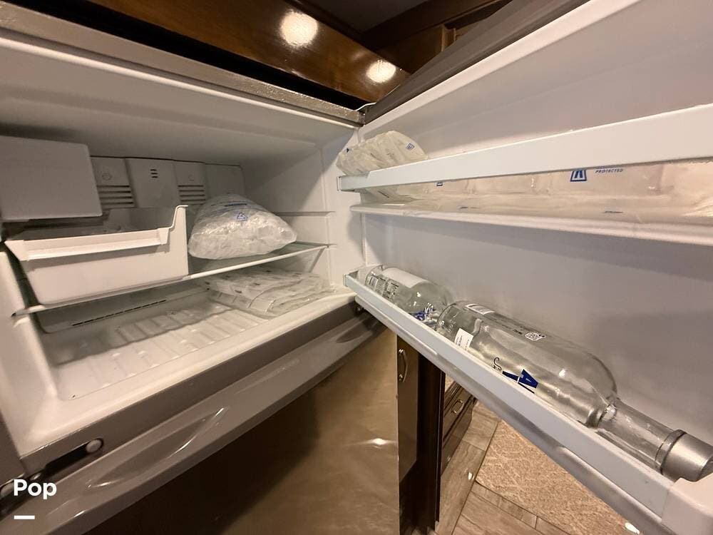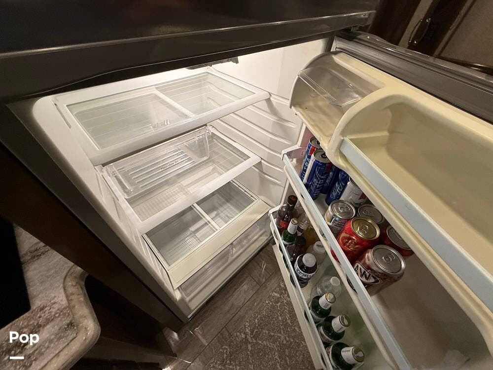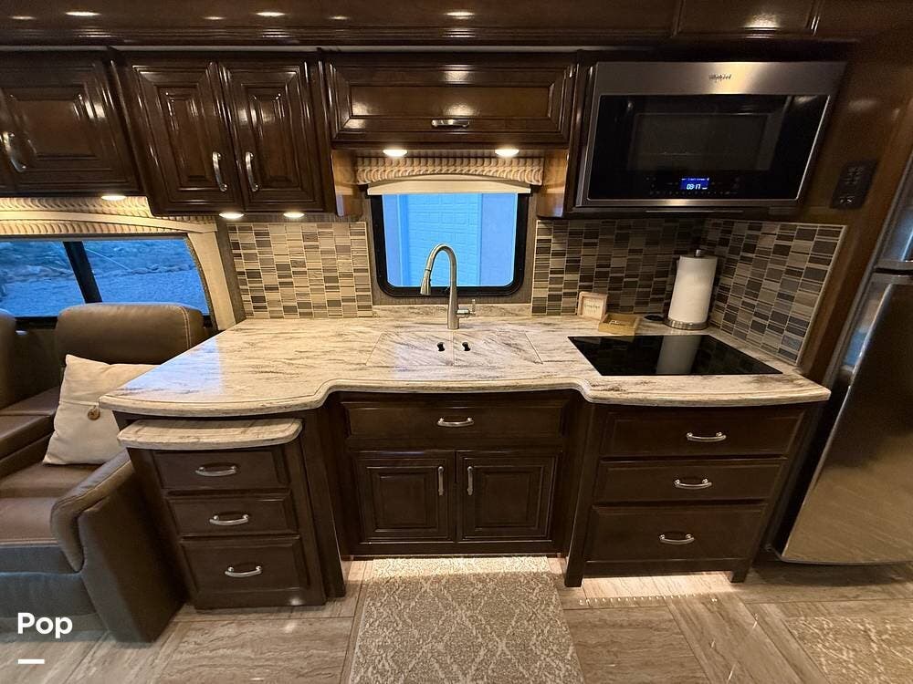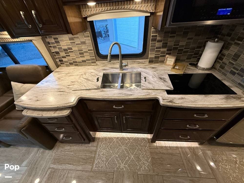 The gourmet kitchen comes complete with solid-surface countertops, a full-size residential refrigerator, induction cooktop, convection microwave, and plenty of storage -- making mealtime on the road a pleasure.