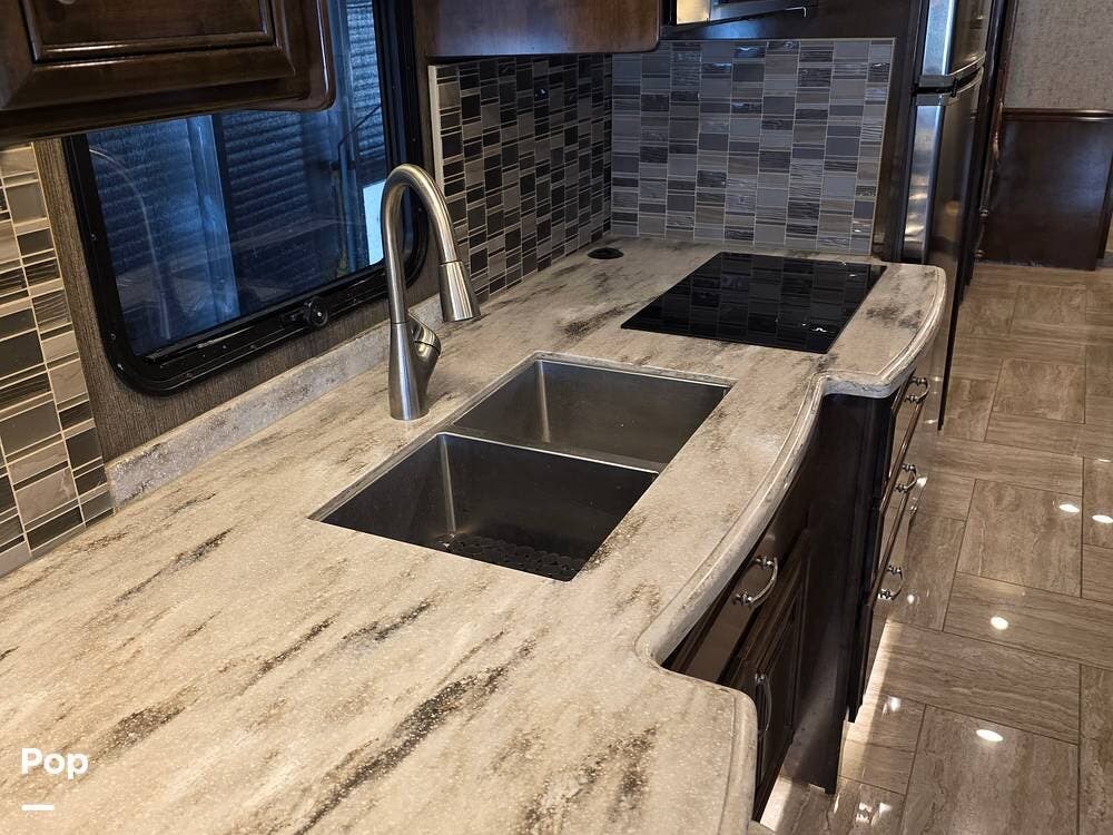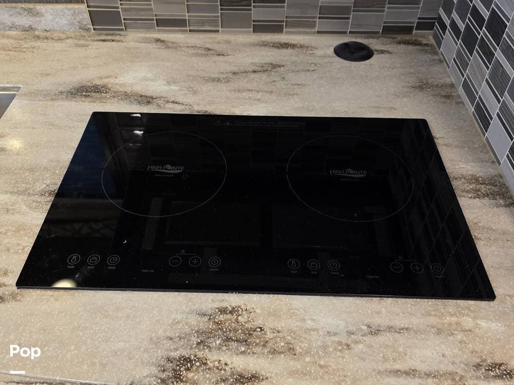 The kitchen features a residential refrigerator, a cooktop, an oven, a convection microwave, solid-surface countertops, and a center island with a sink. Pantry space and cabinets provide storage, and it has a very large booth for dinning.