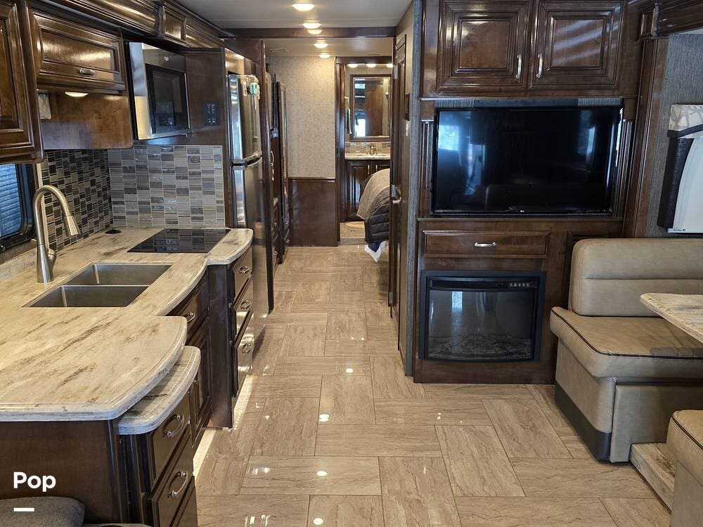The interior uses a triple slide-out layout that opens up the living area. The main space includes lounge seating, overhead cabinets, LED lighting, a large TV, and an electric fireplace. A power drop-down bunk over the cab adds extra sleeping space without taking up floor space.