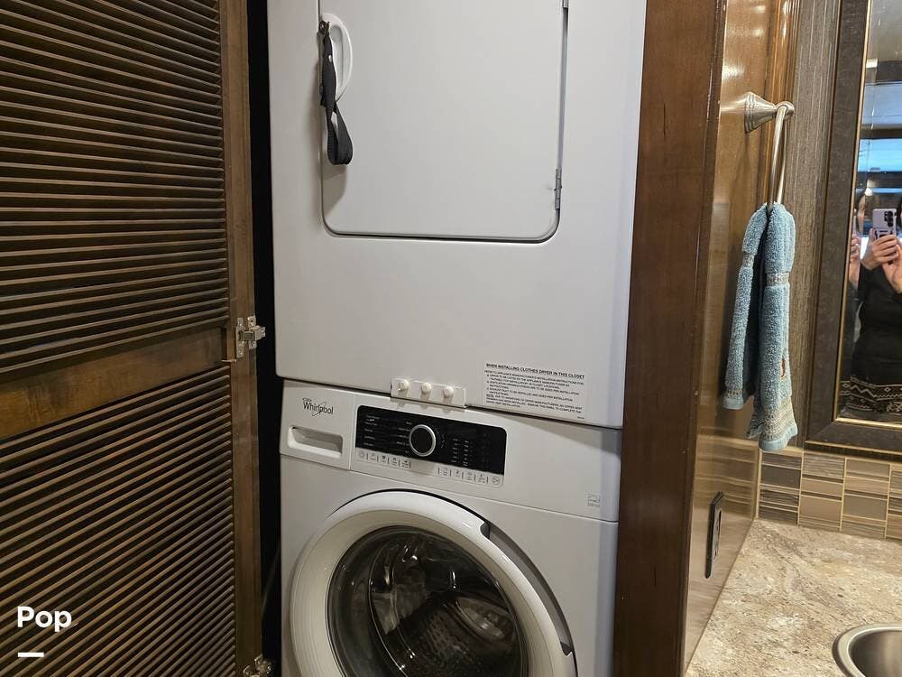 The rear bedroom has a king-size Tilt-A-View bed with storage, closets, drawers, and a dedicated TV. Washer and dryer prep is typically included. The bath-and-a-half layout includes a full bathroom with a walk-in shower and vanity, as well as a separate half bath.