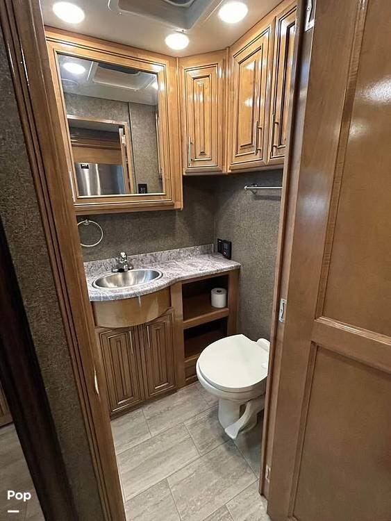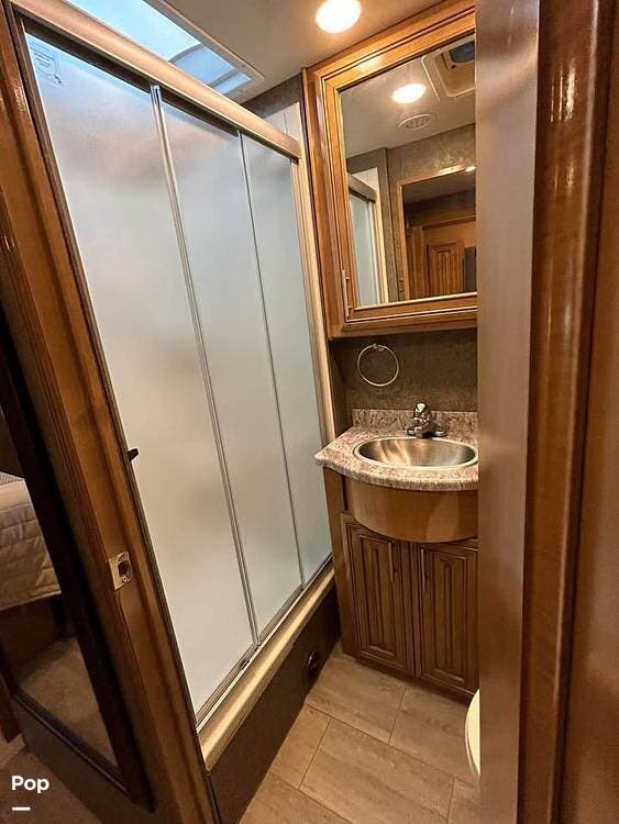 The full bathroom includes a large shower, vanity, and modern finishes, ensuring home-like comfort wherever you travel.