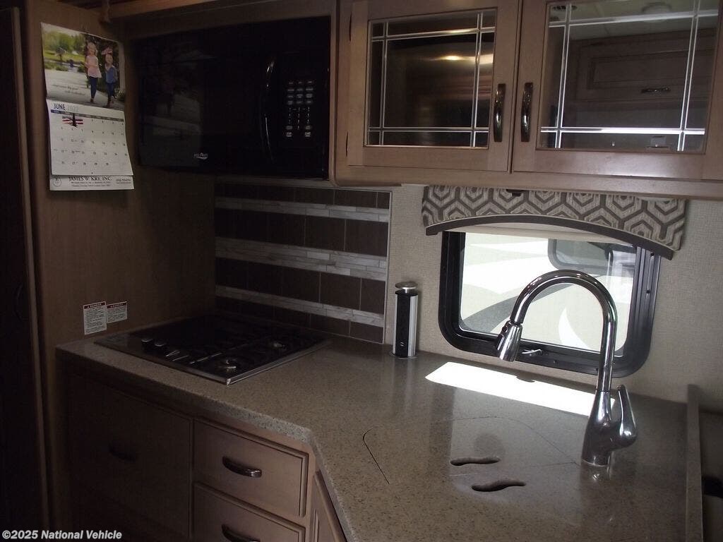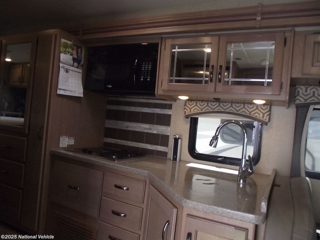 Step inside to a bright, open interior made even more spacious by multiple slide-outs that create a true residential feel. The living area features comfortable seating, a large dinette, and an entertainment center?perfect for relaxing after a day of exploring. Oversized windows allow natural light to fill the space, enhancing the warm, welcoming atmosphere.