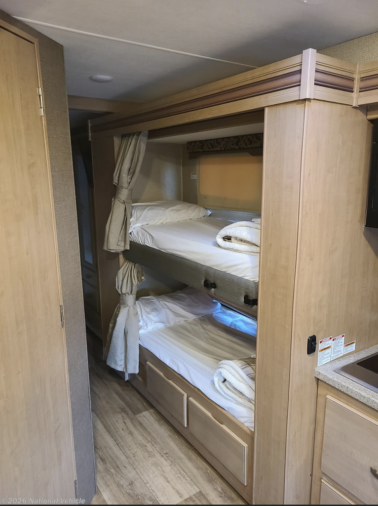 Bunkhouse Floorplan: Perfect for families, the 31E includes two cozy bunk beds, a cab-over bunk, a convertible dinette and sofa, plus a walk-around queen bed in the rear master suite.