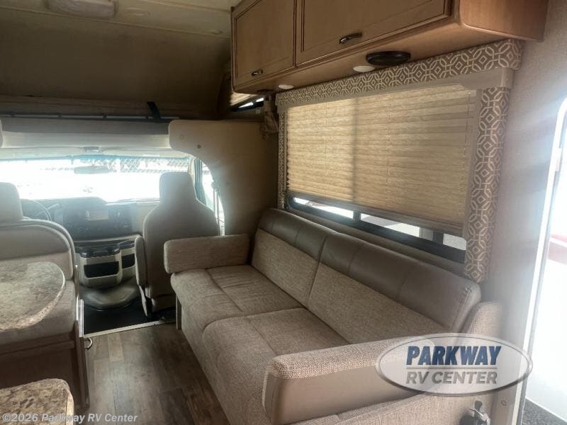 There are plenty of comforts throughout this 26HE Freedom Elite motor home by Thor Motor Coach, such as a single slide out, and a full-size bathroom, plus in the front area just past the cab you will find seating for your whole family at the dinette and sofa.