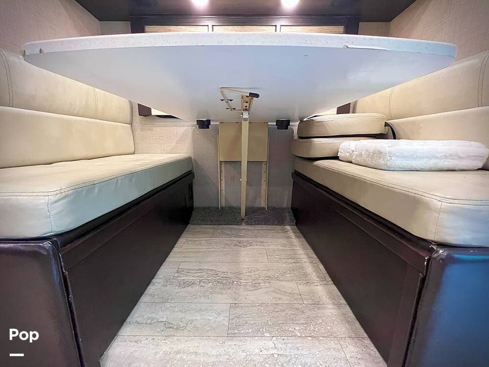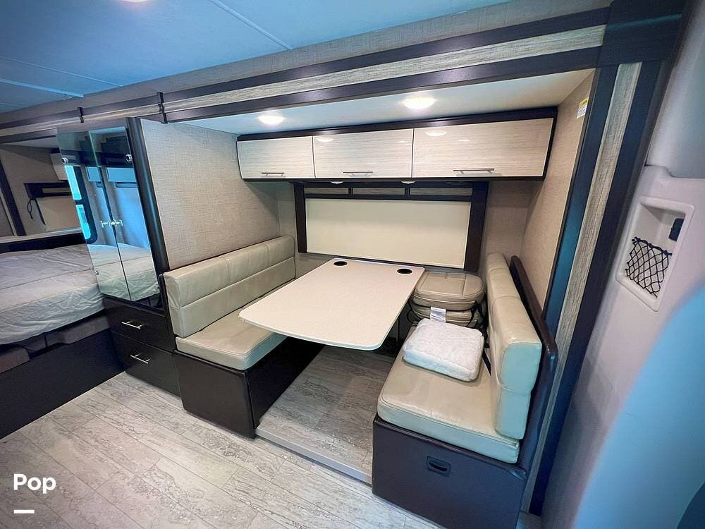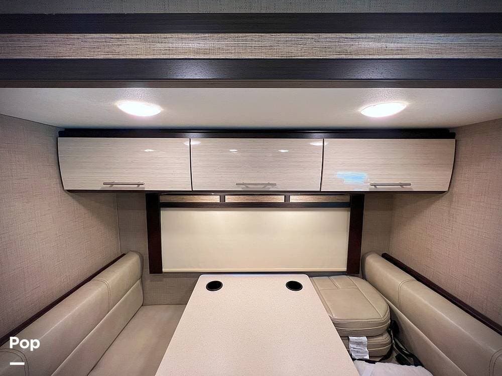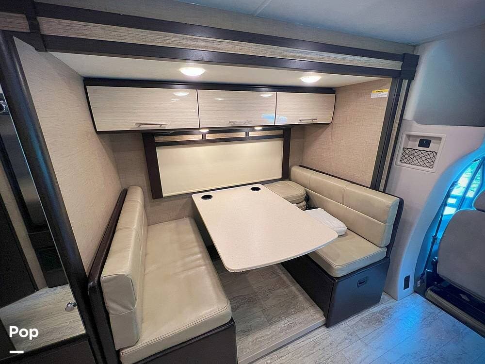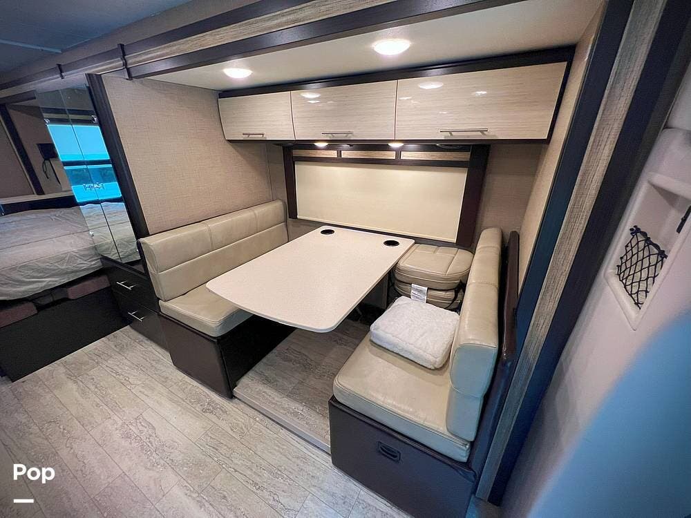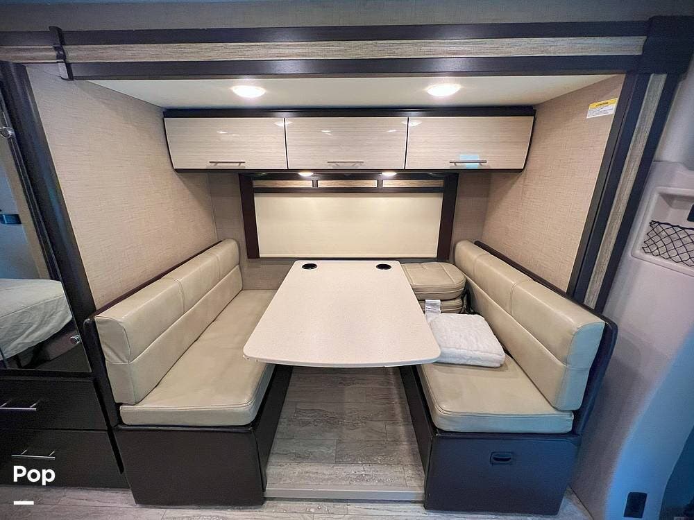 Stepping through the side entry door, you enter a bright and open living area. The dinette is set beneath wide windows, allowing natural light to spill into the interior. It serves as both a dining space and a comfortable spot for relaxing or working on the road. The table can be removed or adjusted when not in use, and the dinette converts into an additional sleeping area when needed. Overhead cabinets run along the wall, providing ample storage for daily items.