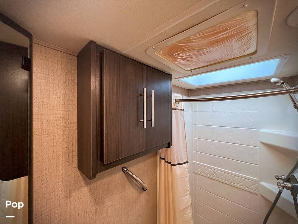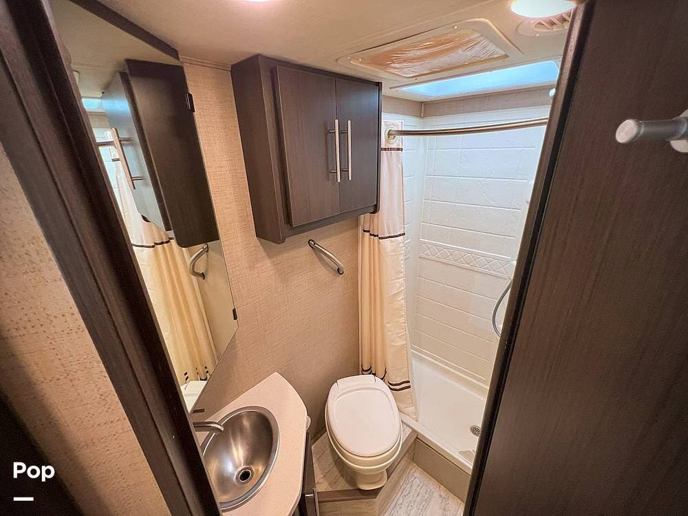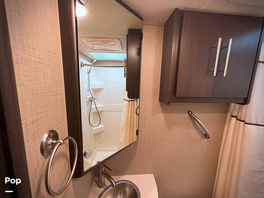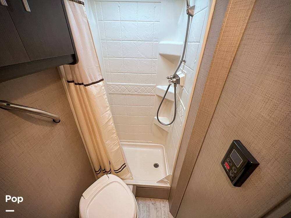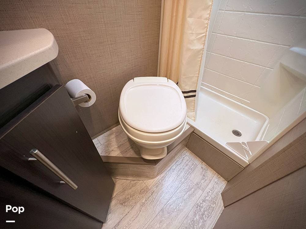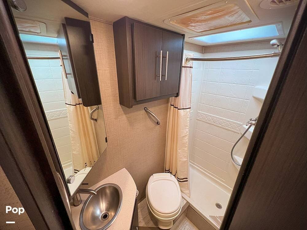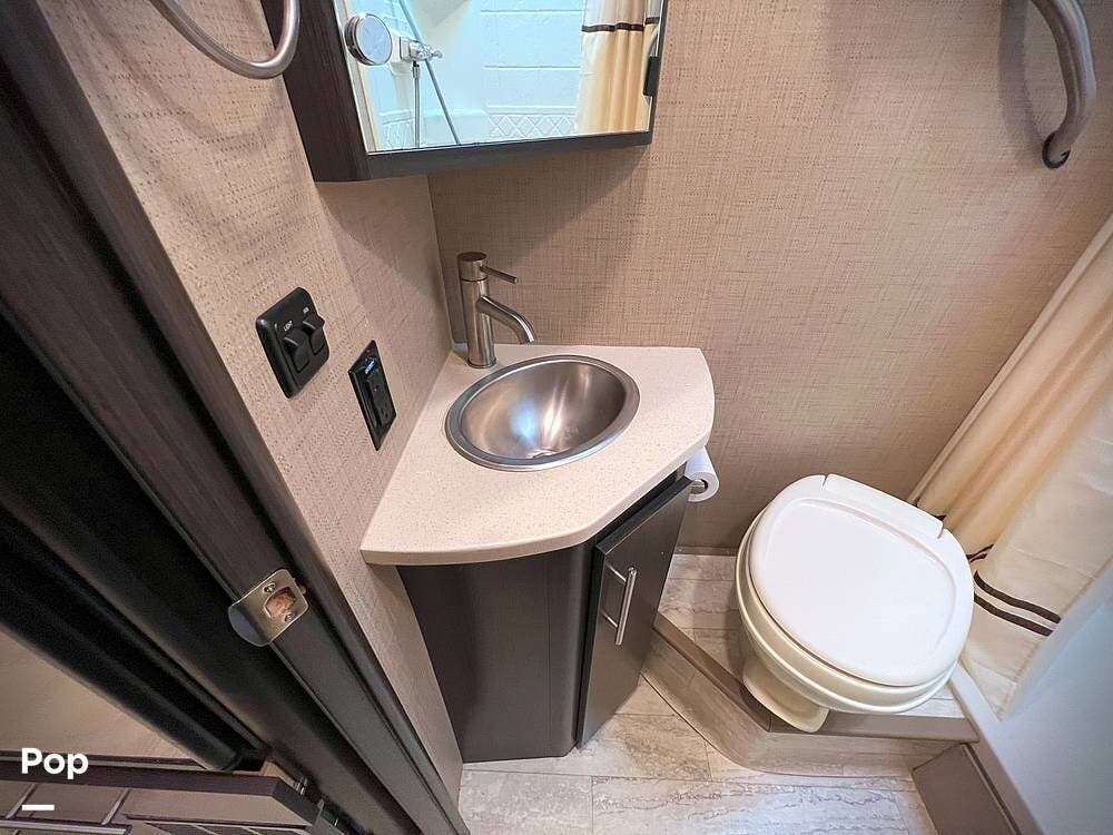 Just beyond the galley is the bathroom, which makes clever use of its footprint. It features a fully enclosed shower, a toilet with a foot flush, and a vanity with a sink, along with storage for linens and toiletries. Despite the coach's compact size, the bathroom feels private and functional.