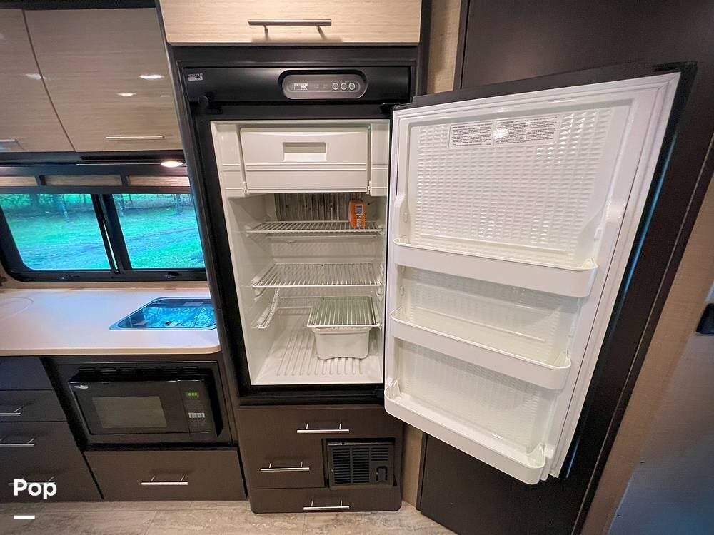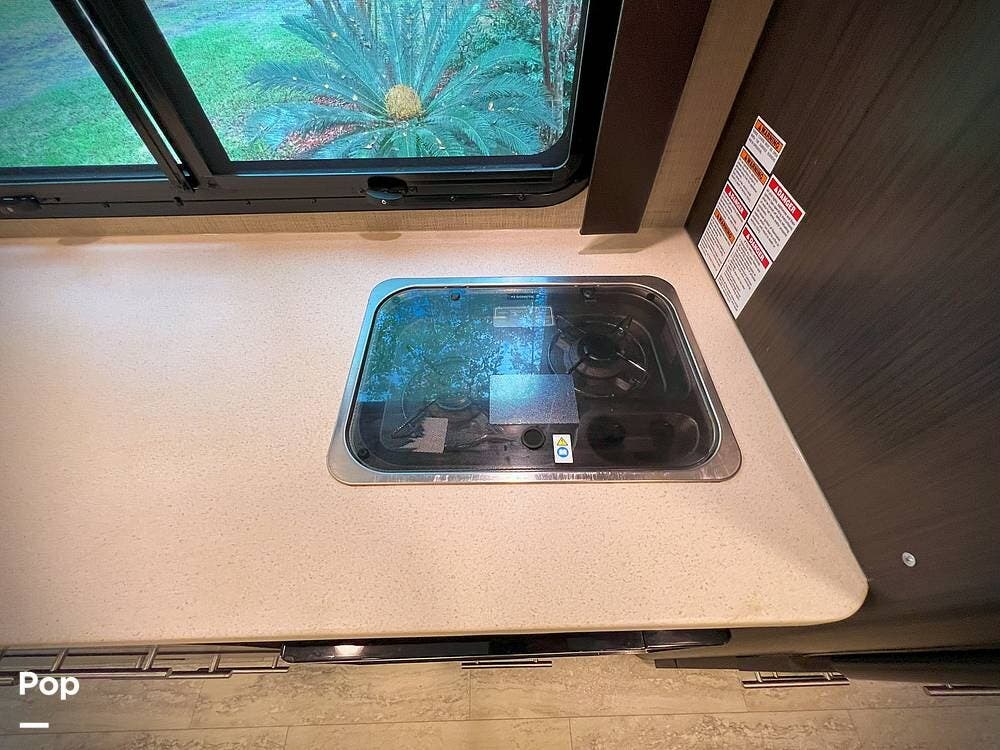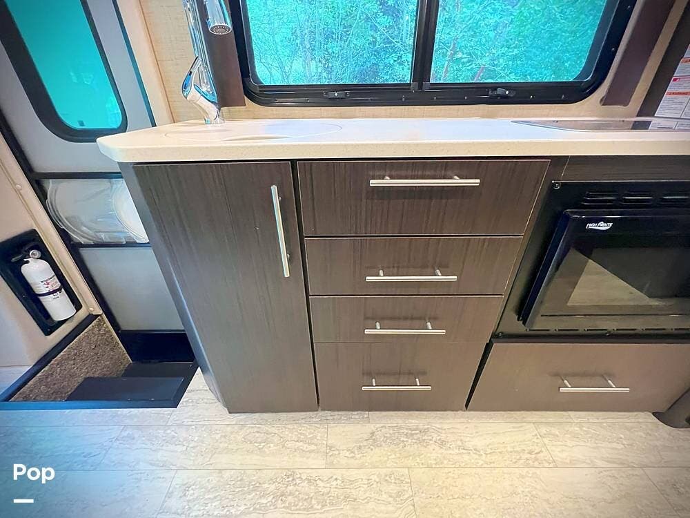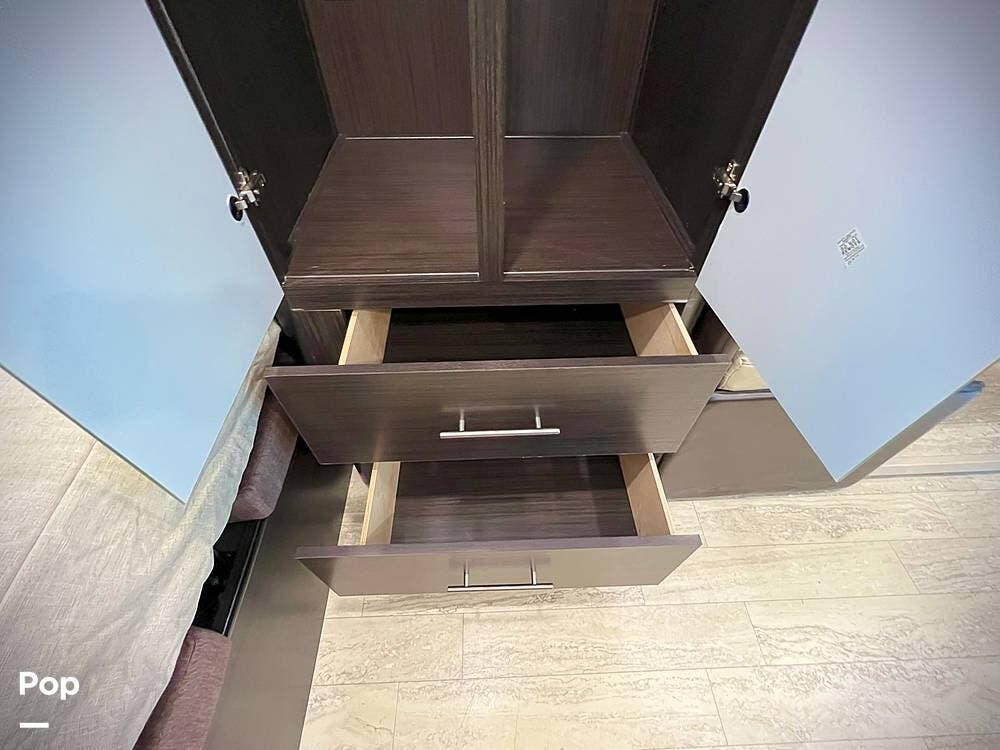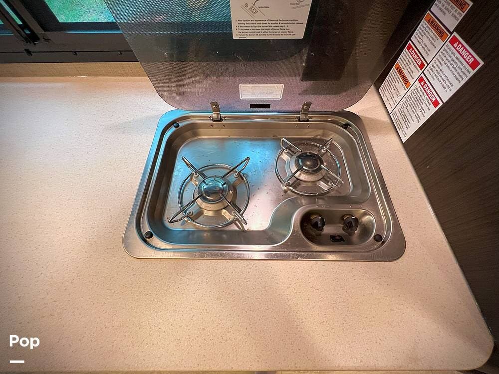 The kitchen sits directly across, designed to maximize efficiency without wasting space. It includes a stainless-steel sink with a cover for extra prep space, a two-burner cooktop, and a convection microwave, providing you with plenty of flexibility for cooking meals on the go. A refrigerator is conveniently tucked within the cabinetry, and multiple drawers and cabinets keep cookware, dishes, and supplies neatly organized.