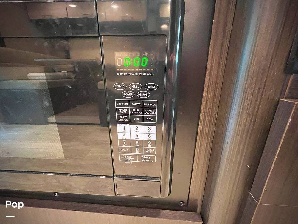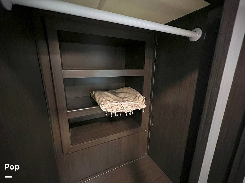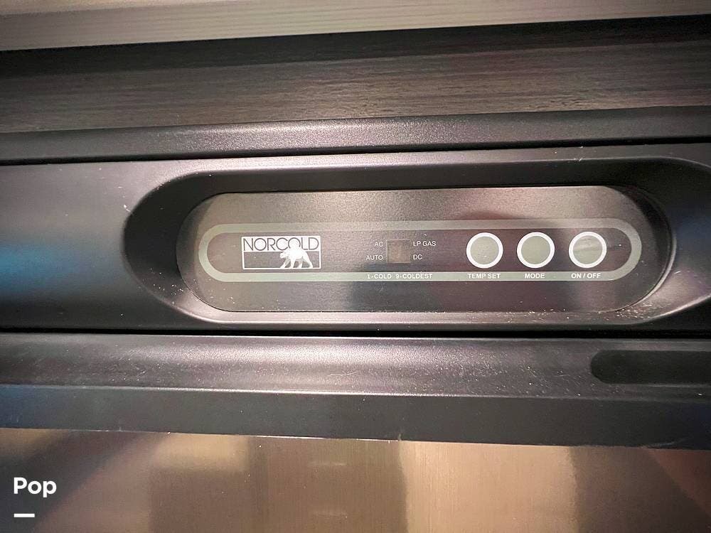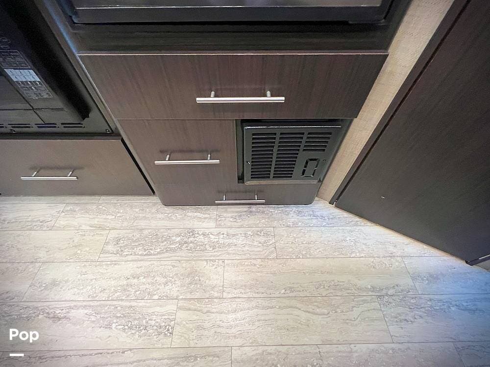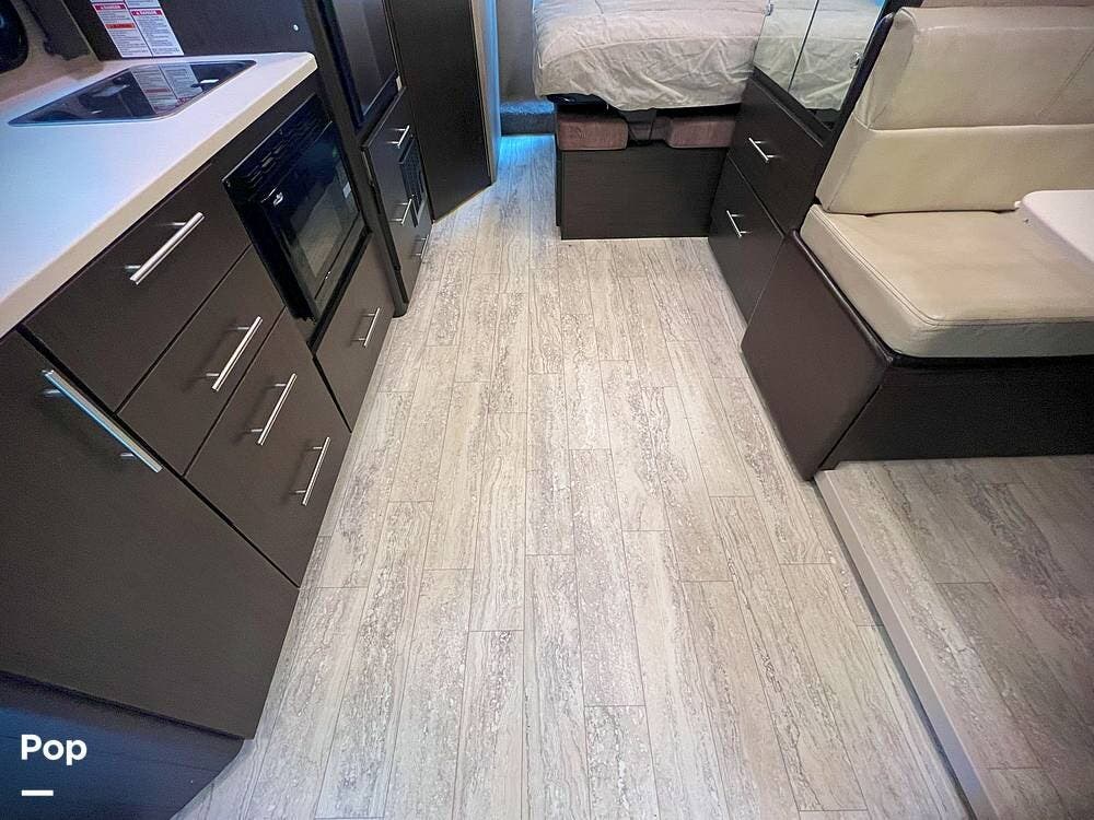 The kitchen sits directly across, designed to maximize efficiency without wasting space. It includes a stainless-steel sink with a cover for extra prep space, a two-burner cooktop, and a convection microwave, providing you with plenty of flexibility for cooking meals on the go. A refrigerator is conveniently tucked within the cabinetry, and multiple drawers and cabinets keep cookware, dishes, and supplies neatly organized.