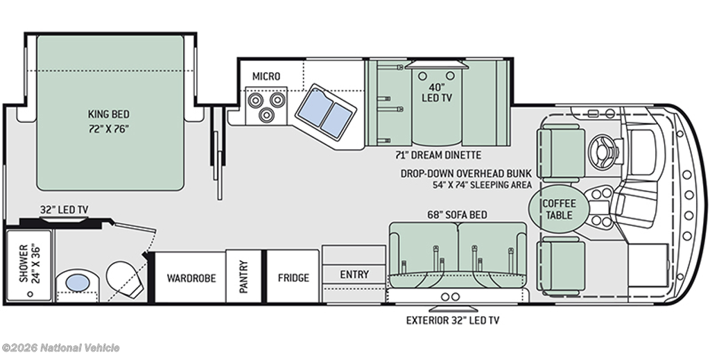 Inside, the spacious dual slide-outs create an open and inviting living area. Relax in comfort with soft leather furnishings, a Dream Dinette, and swivel captain?s chairs that easily convert the front cabin into a social space. Entertainment is everywhere with two 40" interior LED TVs, plus a 32" exterior TV for outdoor enjoyment under the power awning with LED lighting.