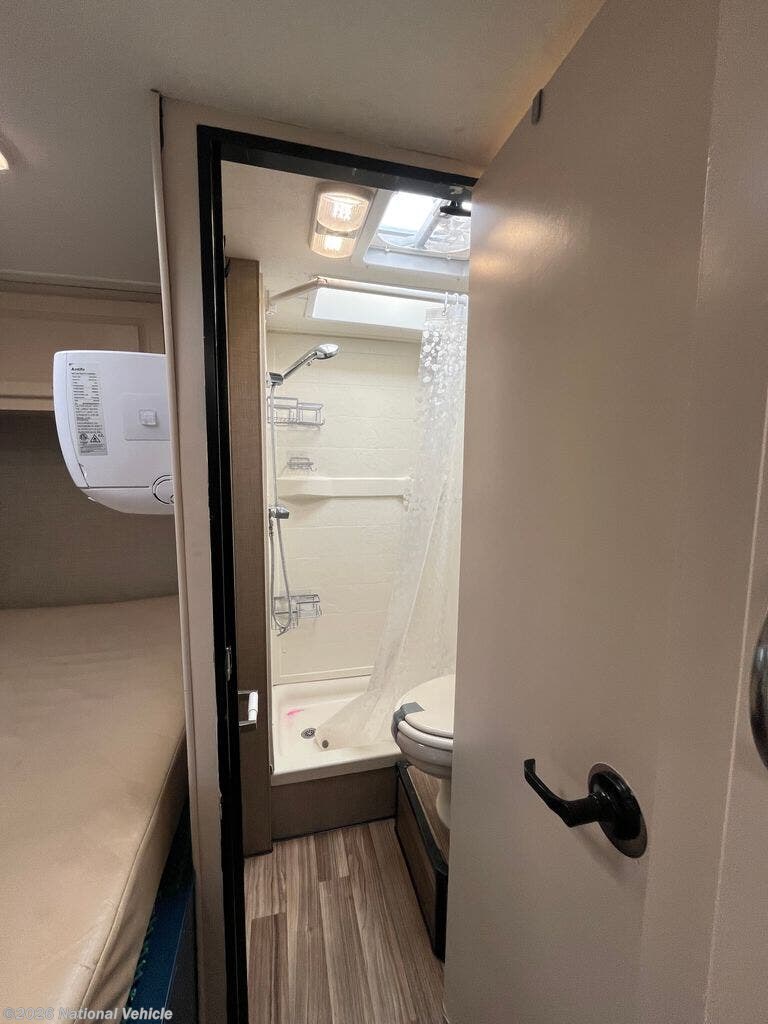 This coach features a bathroom complete with shower, toilet, and a sink with a medicine cabinet above for your convenience.