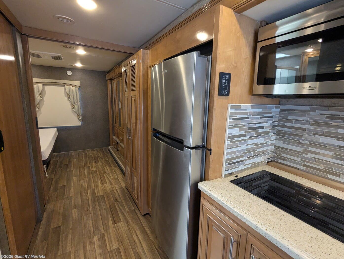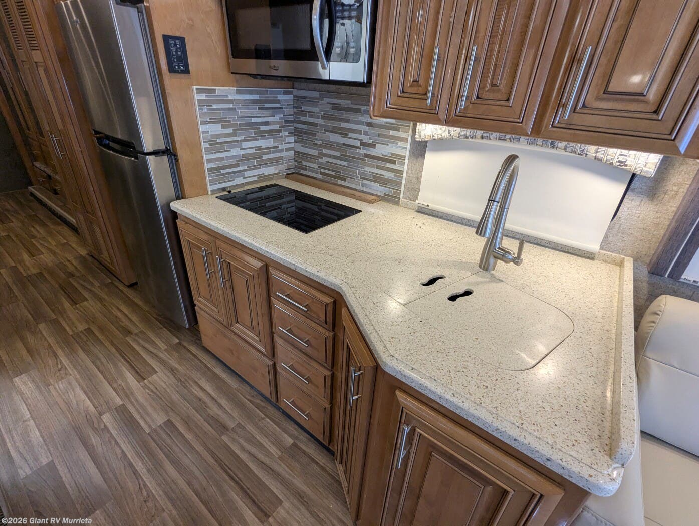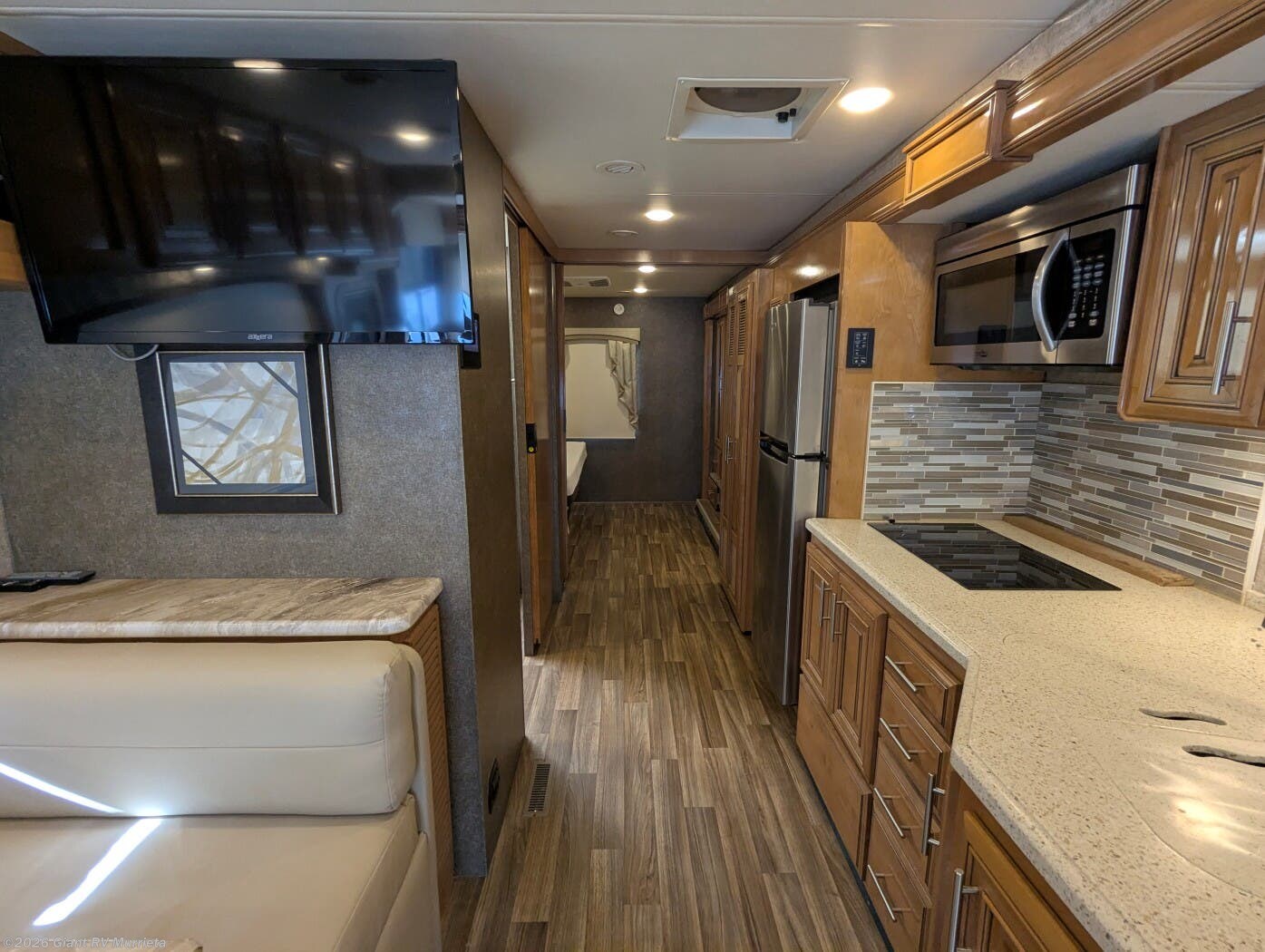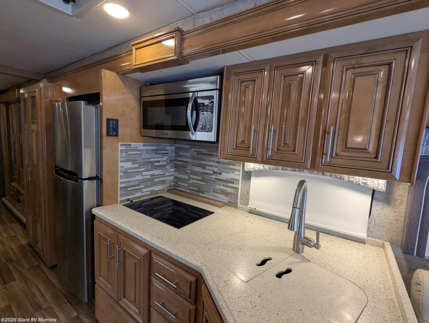- Residential Kitchen & Lounge including solid-surface countertops, a large refrigerator, sofa seating, entertainment center, and a well-equipped galley for easy mealtime prep.