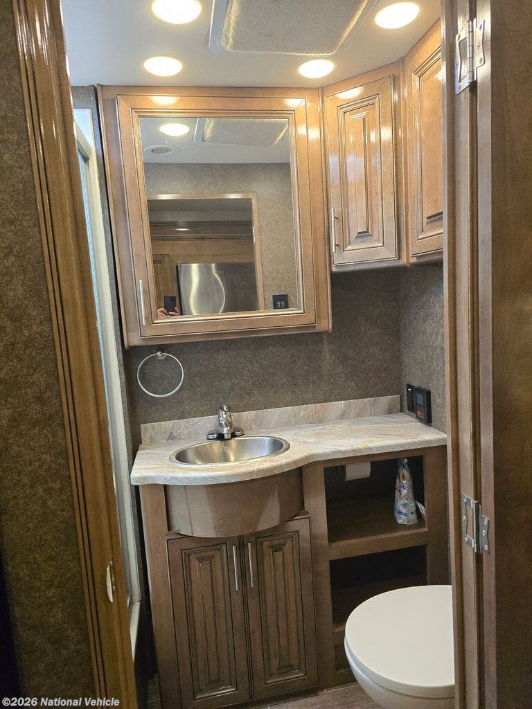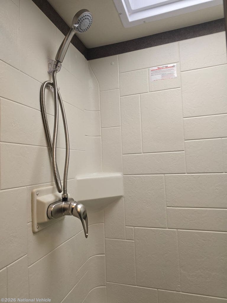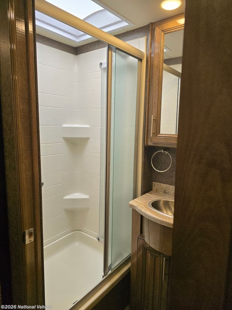 A major highlight of the Miramar 35.2 is its spacious full bathroom mid-coach for guests with a large shower, vanity, and plenty of storage.