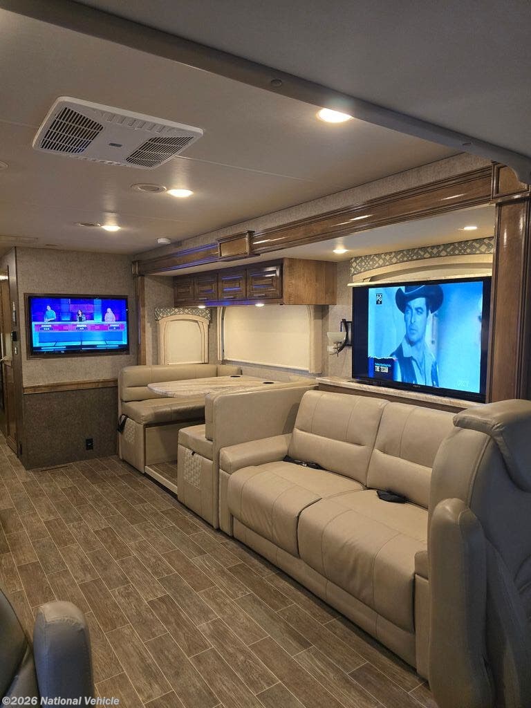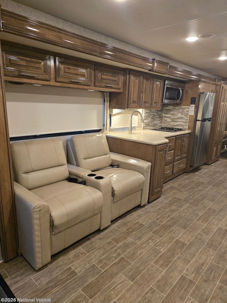 The main living area is open and inviting thanks to multiple slide-outs, featuring comfortable seating options including a sofa and theater seating, along with a Dream Dinette. The entertainment center creates a cozy atmosphere, making it easy to relax or entertain while on the road.