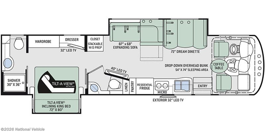 Double slide outs, a king bed, plus a bath and a half, are just a few of the features that will draw your attention to this 35.3 Miramar class A motorhome by Thor Motor Coach. In the living area you can relax and visit with your family at the 72" Dream dinette or at the 87" x 68" expanding sofa. Along the outside wall of the half bathroom there is a 40" LED TV. The fully equipped kitchen features a residential refrigerator as well as a two burner range and a double sink which makes cleaning up a breeze. Above the cab there is a drop-down overhead bunk where two people can sleep, and in the rear bedroom you will find a Tilt-A-View inclining king bed. The master bathroom is located in the rear and is complete with a 30" x 36" shower, sink, extra counter space, and a toilet.