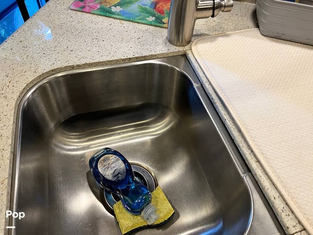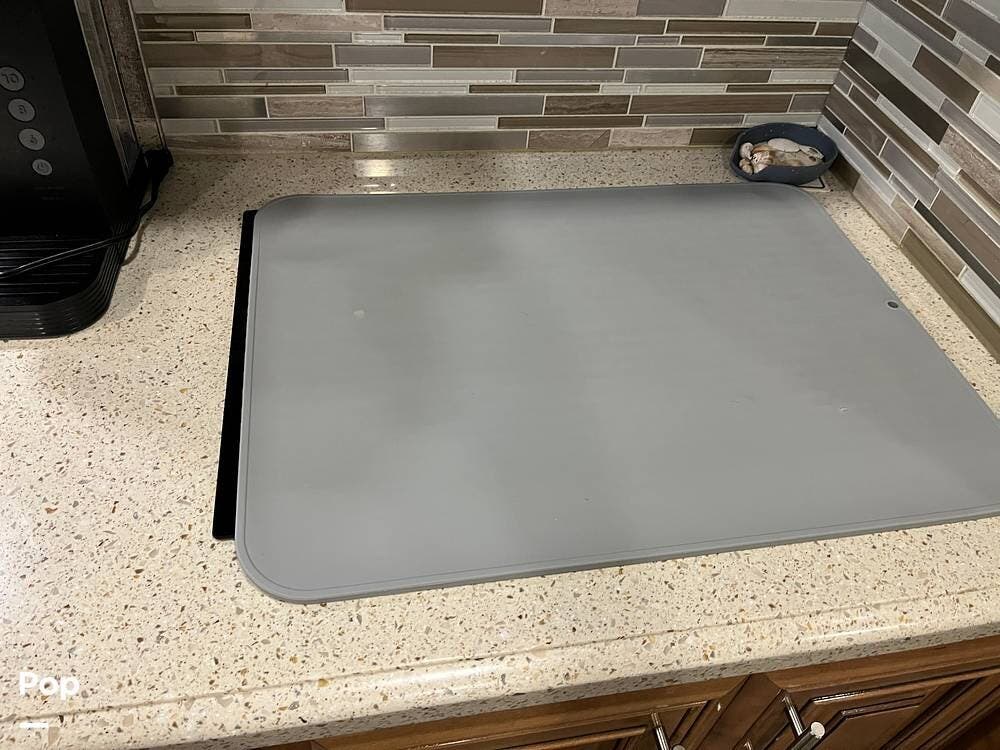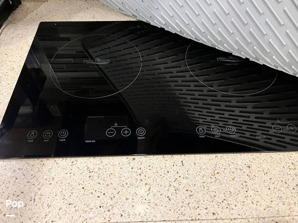 The residential-style kitchen is ready for life on the road, complete with a large refrigerator, induction cooktop, convection microwave, solid surface countertops, stainless steel sink, and pantry.
