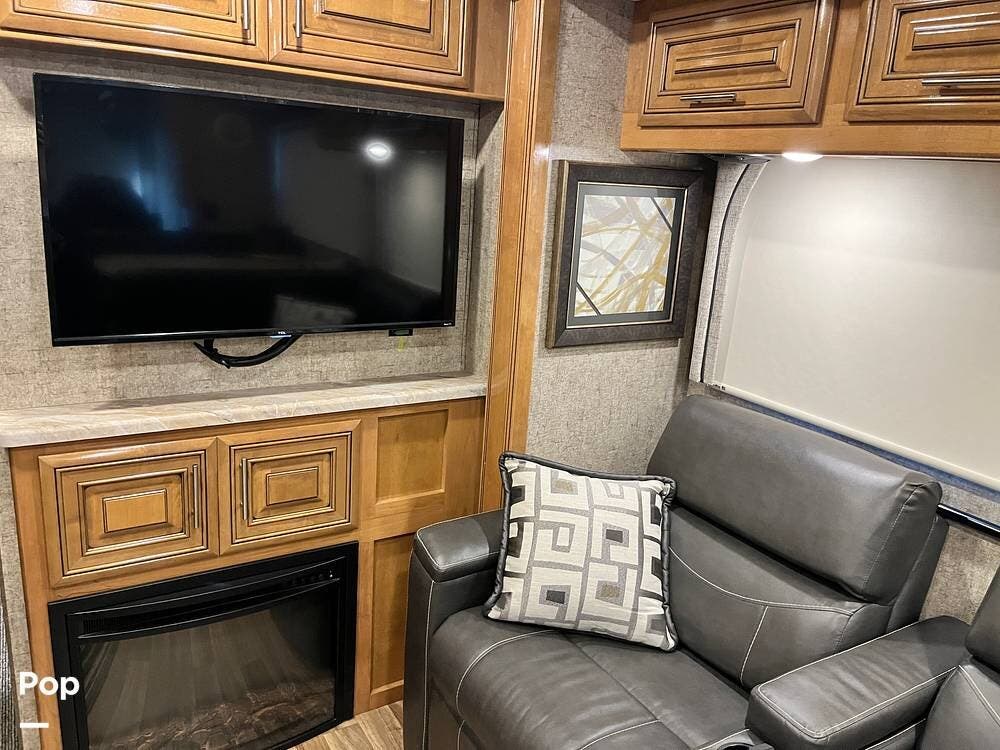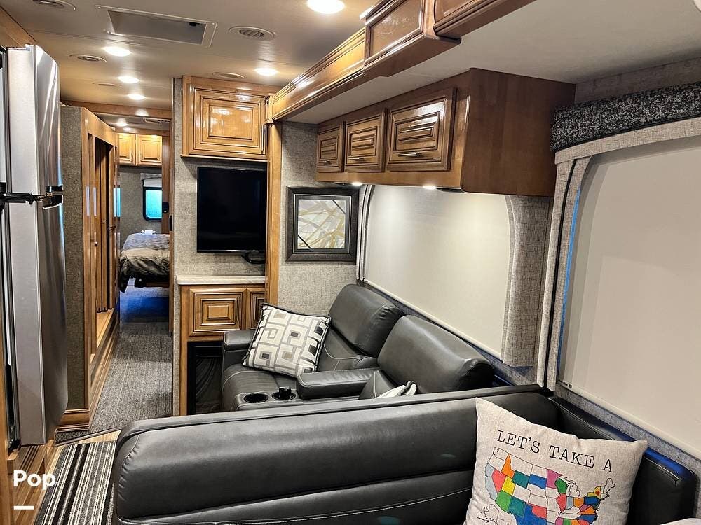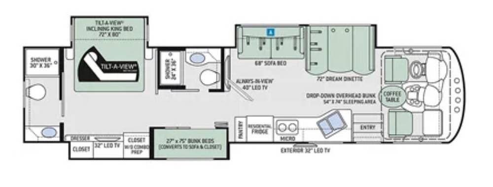 Every inch of this coach was designed for comfort and convenience -- from the multiplex wiring system and touchscreen control panel to dual A/C units (27,000 BTU total), a tankless water heater, theater seating, and a fireplace for relaxing after a day of adventure.
