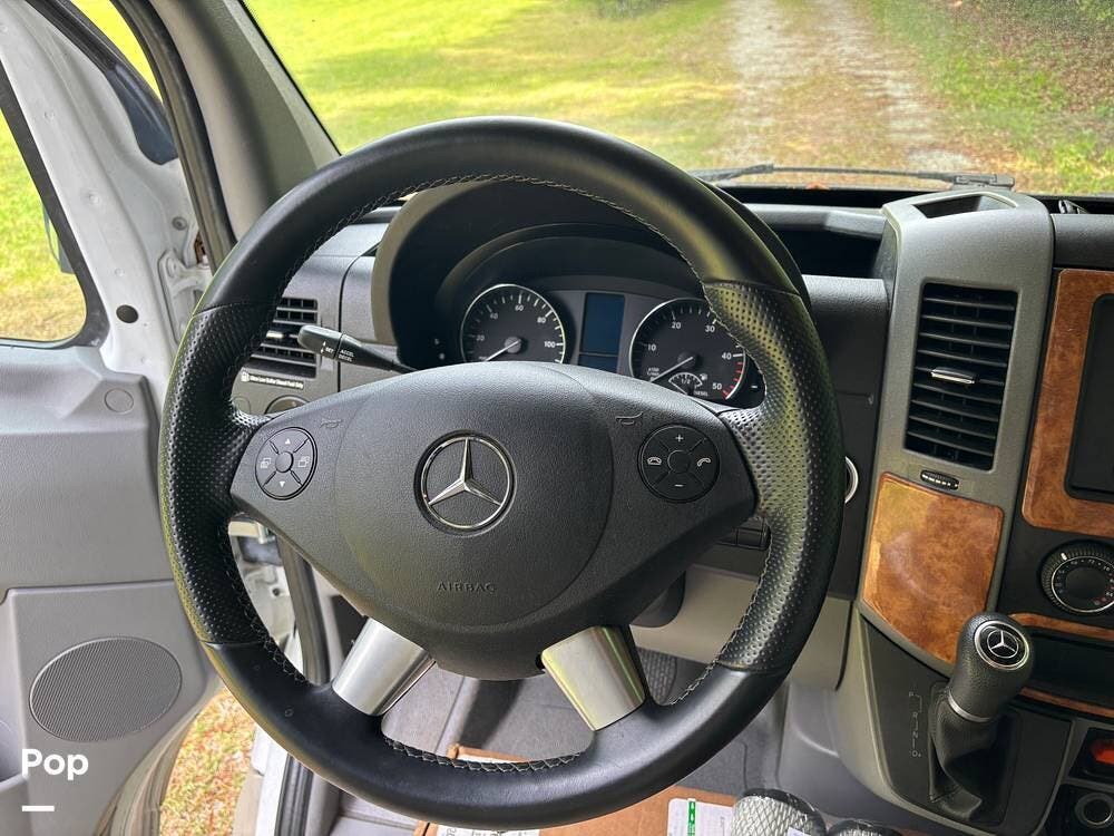 This RV has everything you need for vacation travel, including three sleeping areas, a closet bathroom with a separate door, a generator, and a Mercedes diesel engine.