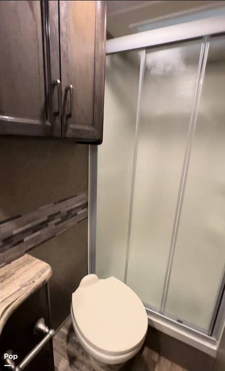 The rear of the unit contains the slide-out king bed in the far wall slide, with access on both sides. The bathroom is fully contained on the patio side wall in the rear of the unit.