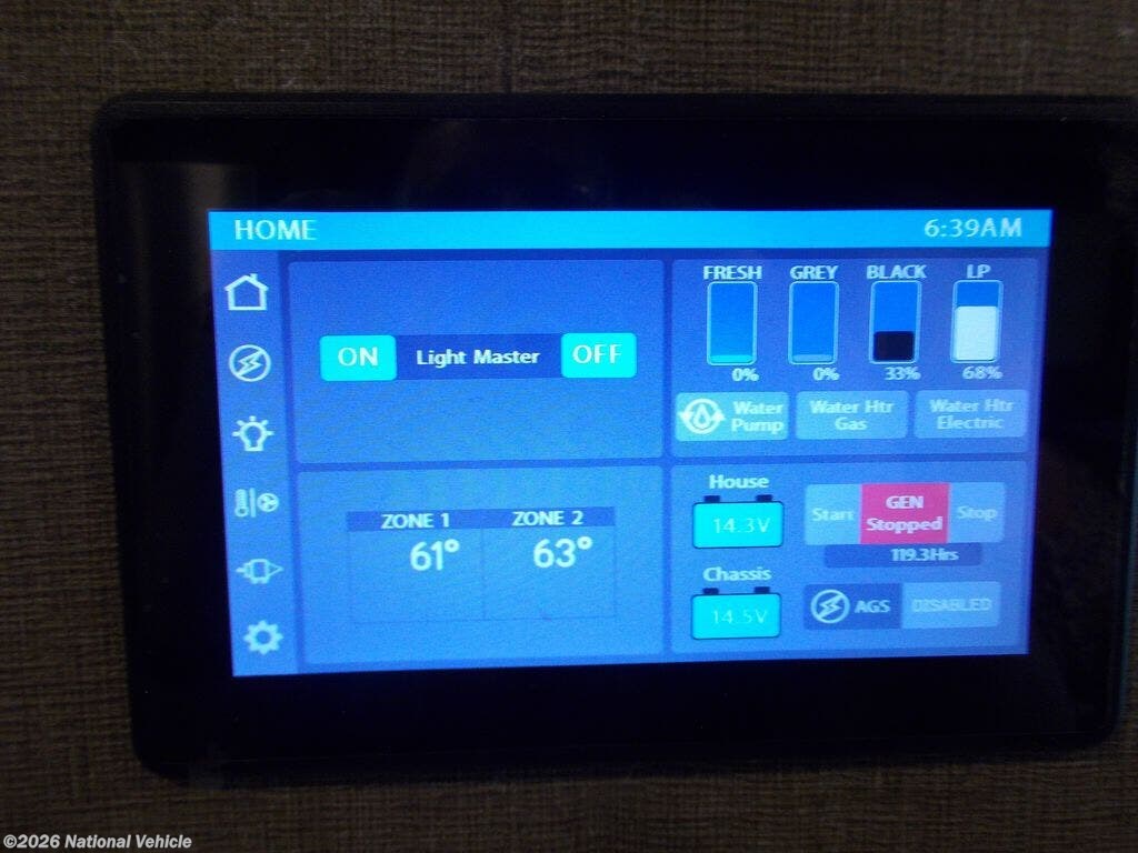 Technology: Firefly Multiplex control system, 10" touchscreen dash radio with navigation, backup camera, Wi-Fi extender, and Bluetooth.