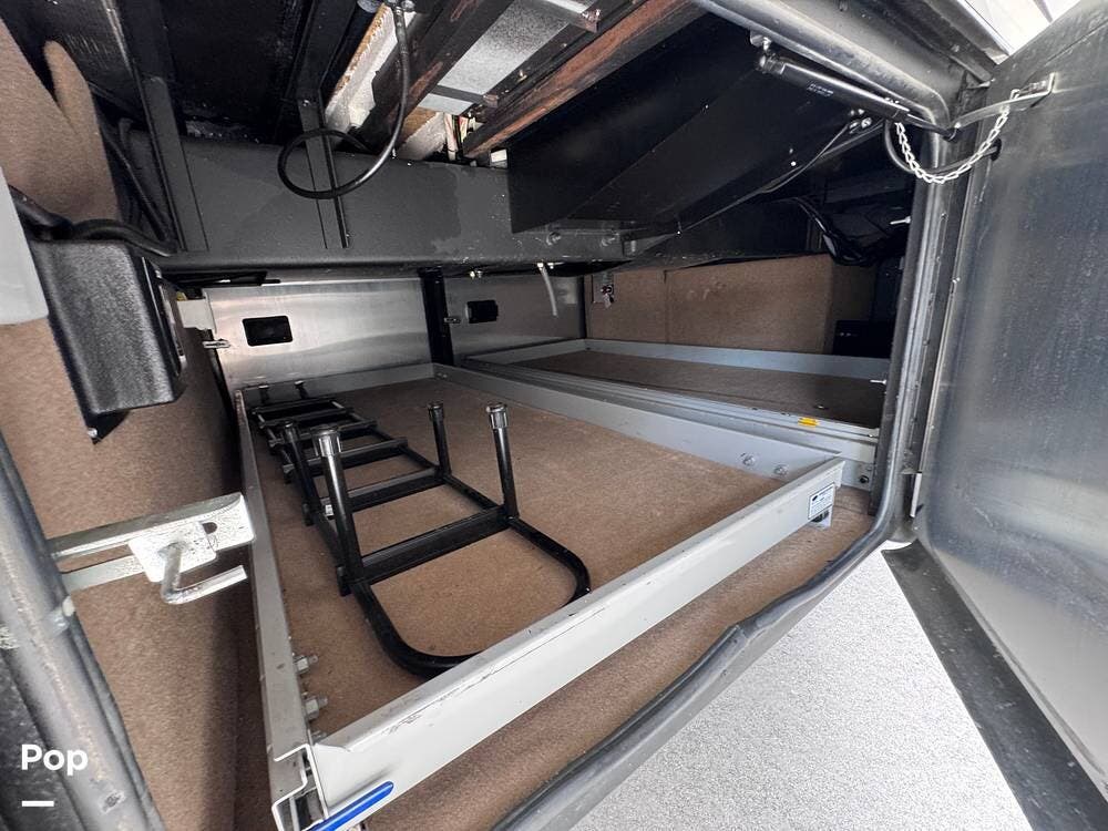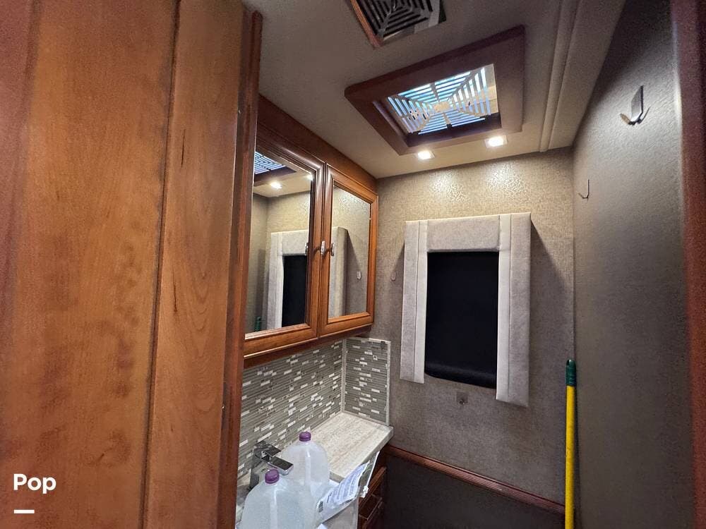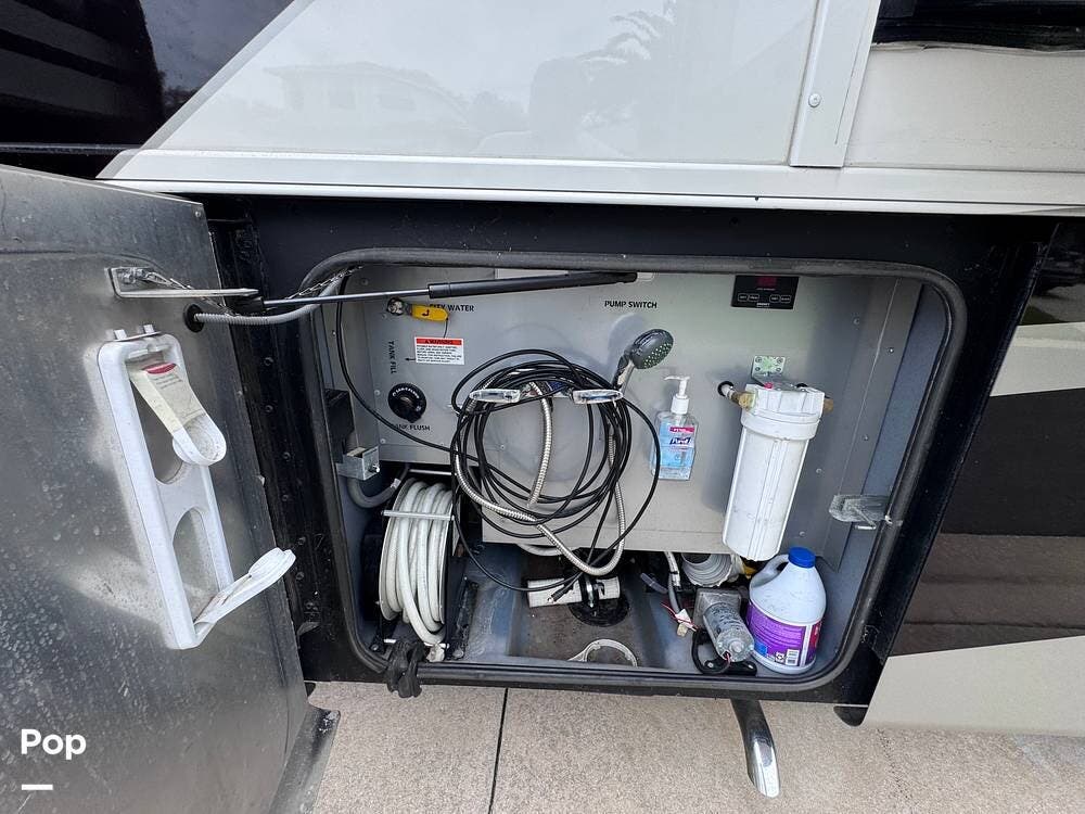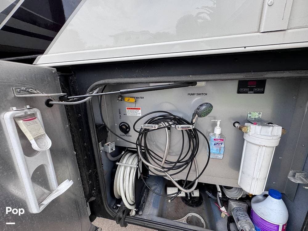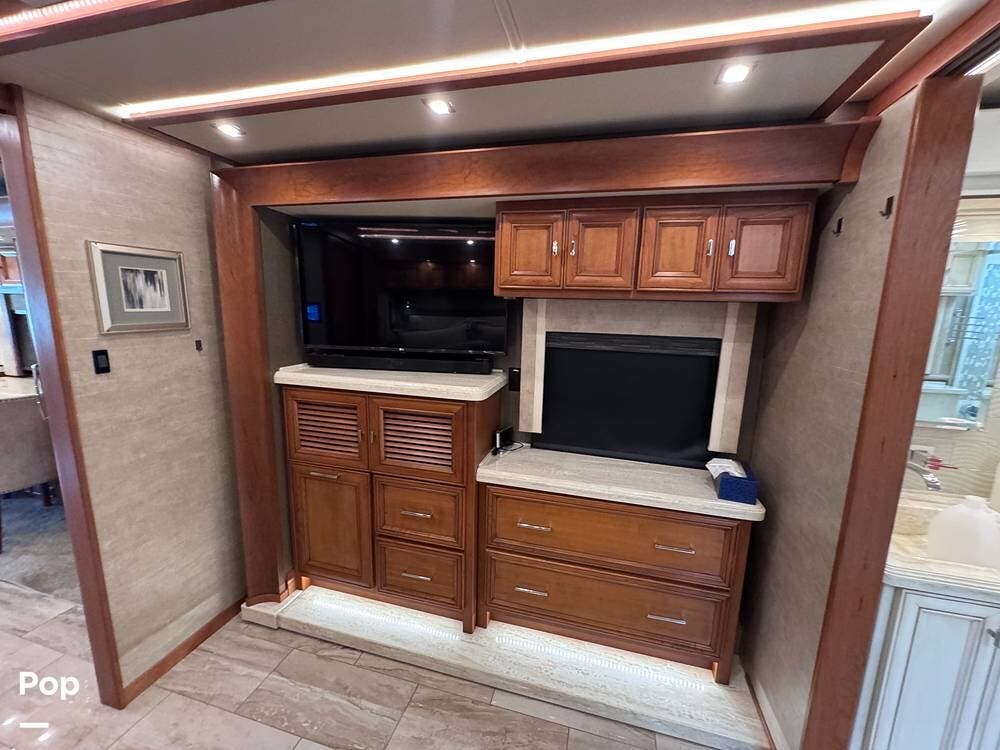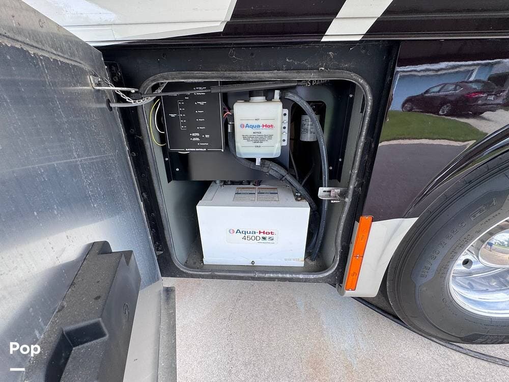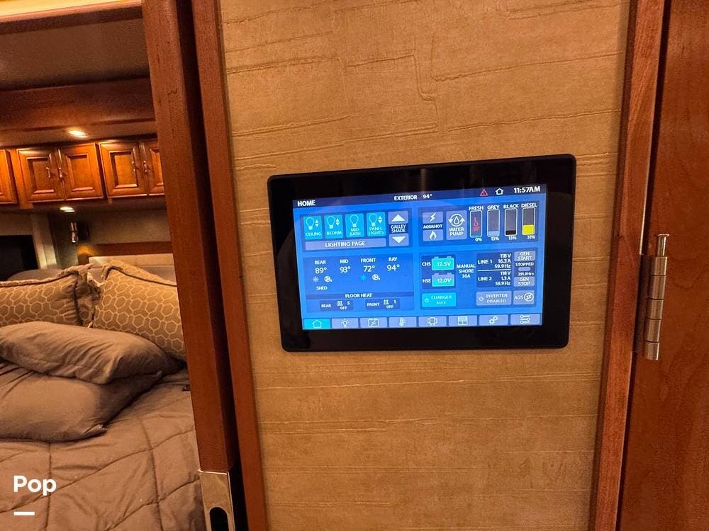 Interior amenities include an AquaHot 450D system, one and a half bathrooms with a shower & dual sinks, stacked laundry washer/dryer units, a full kitchen, an extra-spacious bedroom wardrobe, and multiple televisions.
