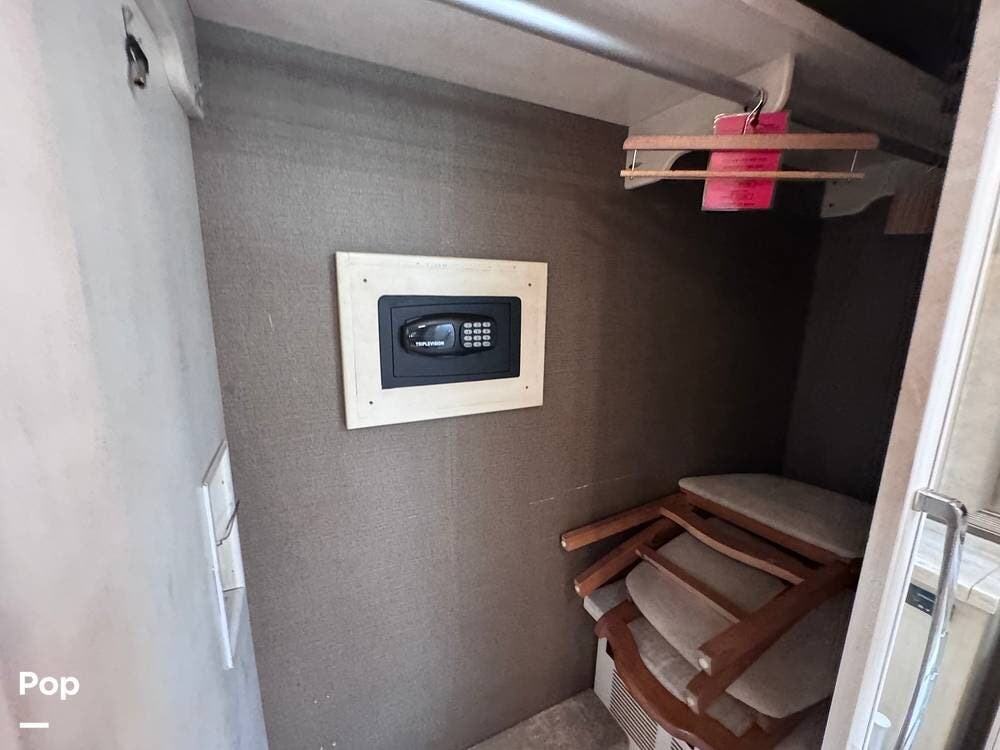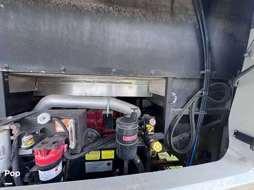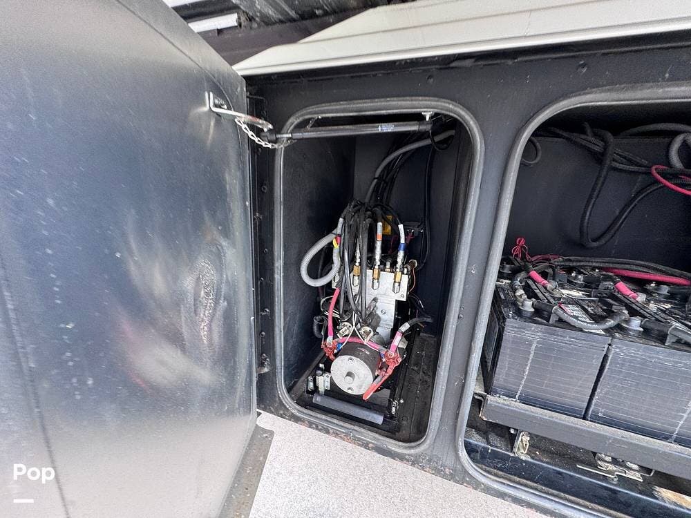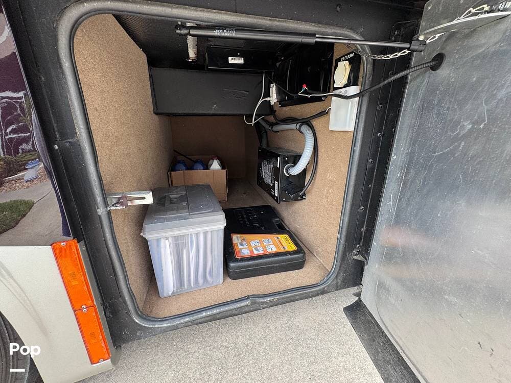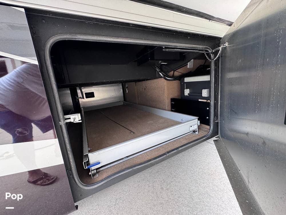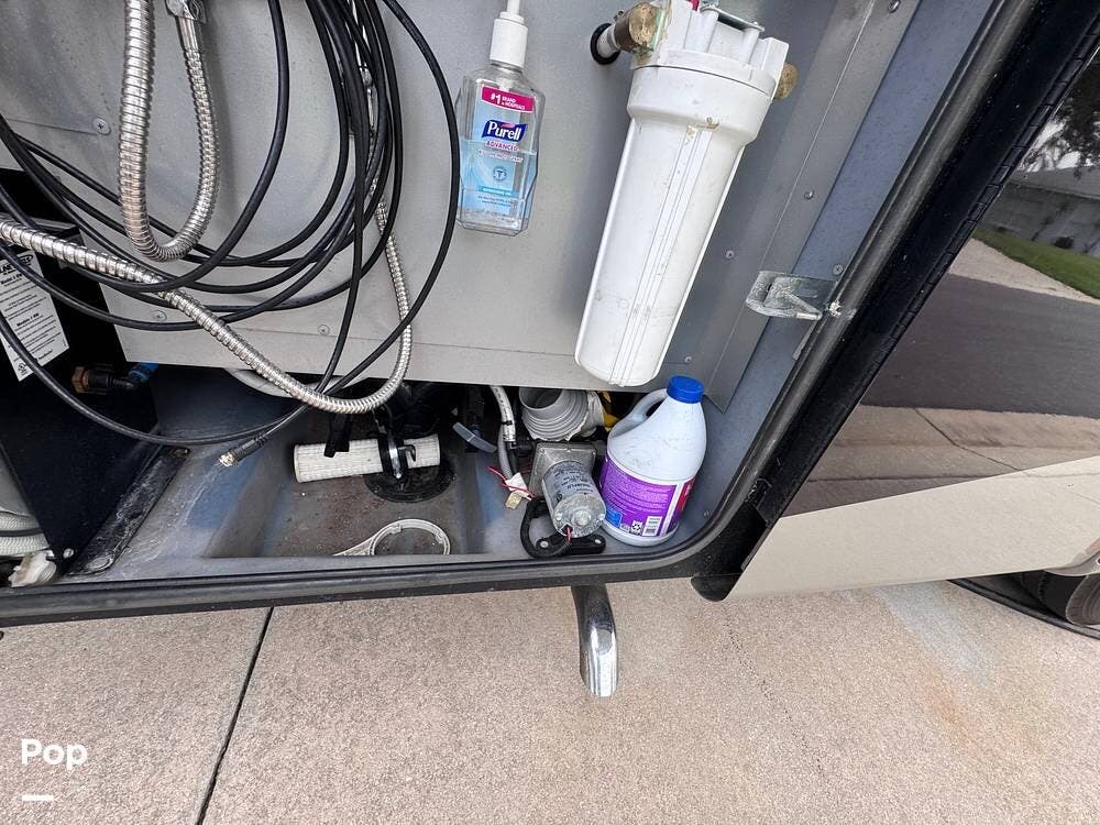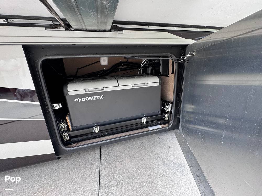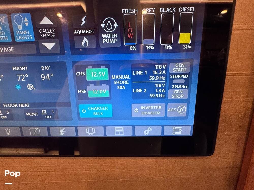 Interior amenities include an AquaHot 450D system, one and a half bathrooms with a shower & dual sinks, stacked laundry washer/dryer units, a full kitchen, an extra-spacious bedroom wardrobe, and multiple televisions.