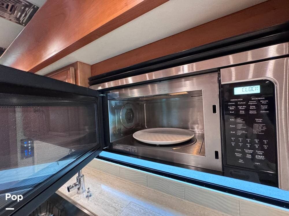 The kitchen contains a stainless residential refrigerator freezer, a convection/microwave combo unit, a covered stovetop range, a sliding pantry, and a sliding table dinette.