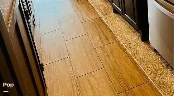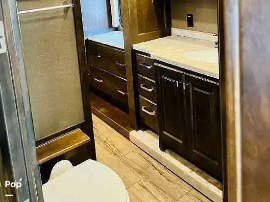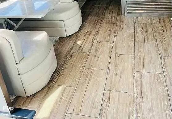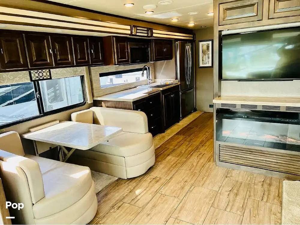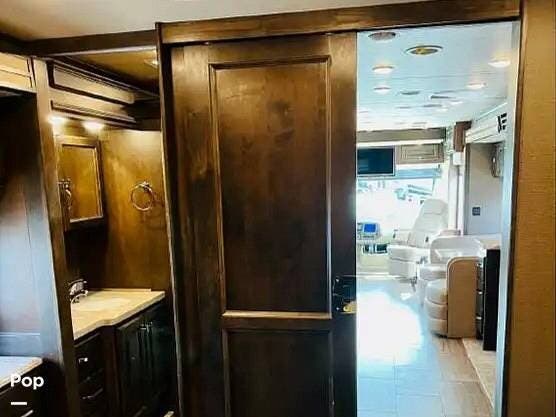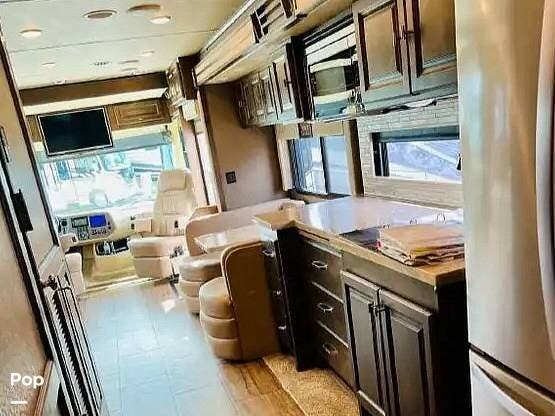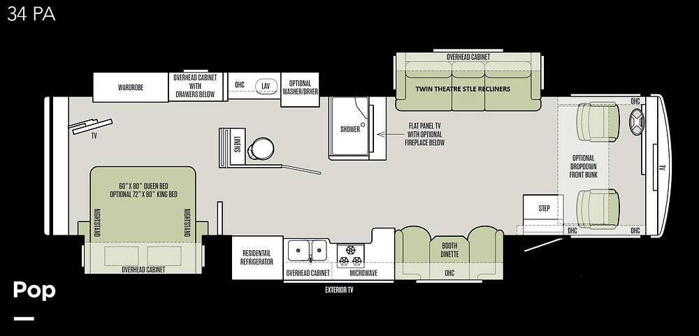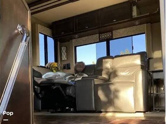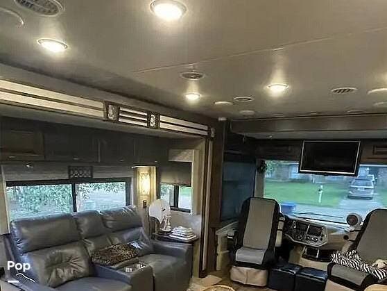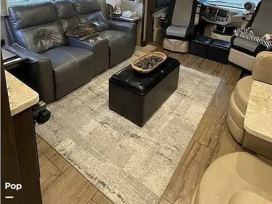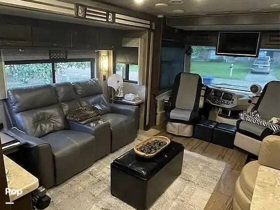 Inside, the living area has been customized for comfort. The original sleeper sofa was replaced with dual reclining theater seats, offering the perfect space to relax and enjoy the fireplace and entertainment system.