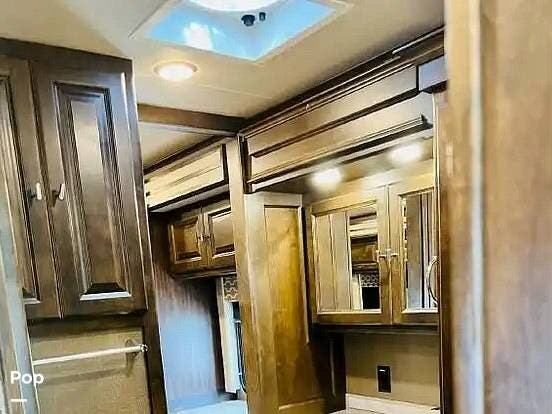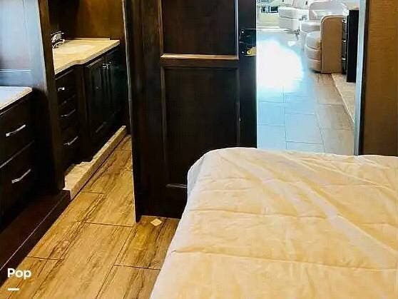 In the bedroom, you'll find a king-size bed, a ceiling fan, overhead cabinets, and a TV. The room feels open and luxurious, perfect for restful nights on the road.