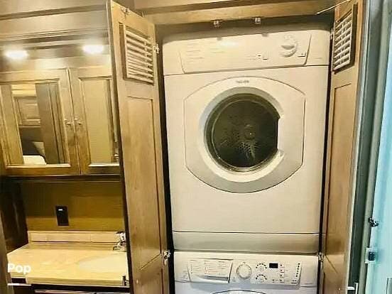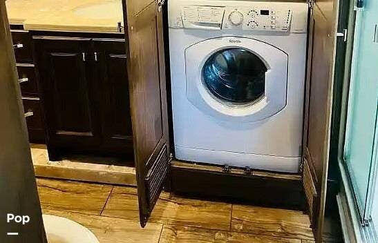 The spacious bath includes a glass-enclosed shower, a solid-surface vanity, and a stacked washer and dryer. A central vacuum system makes clean-up easy, and the 15,000 BTU AC with heat pump keeps the coach comfortable year-round.