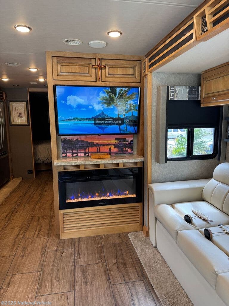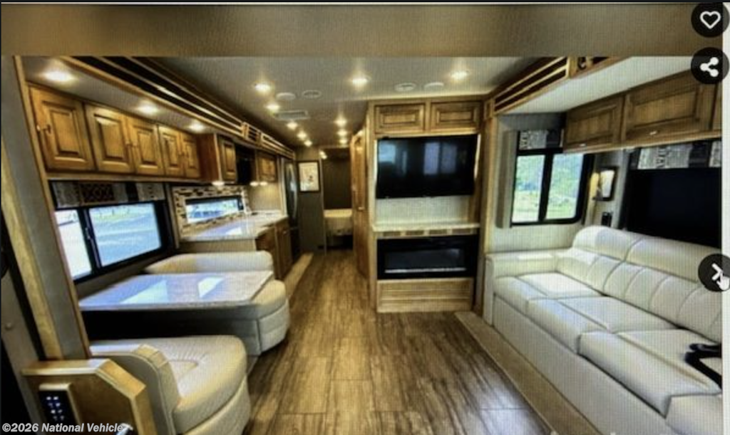 Inside, you?ll find a spacious and thoughtfully designed floorplan that comfortably sleeps four, featuring a king bed in the rear master suite and a queen sofa sleeper with an air mattress. This layout skips the overhead bunk and dinette sleeper, prioritizing open living space and comfort. The living area is warm and inviting, highlighted by a beautiful electric fireplace-perfect for cozy evenings-and four TVs strategically placed throughout the coach for entertainment wherever you are.