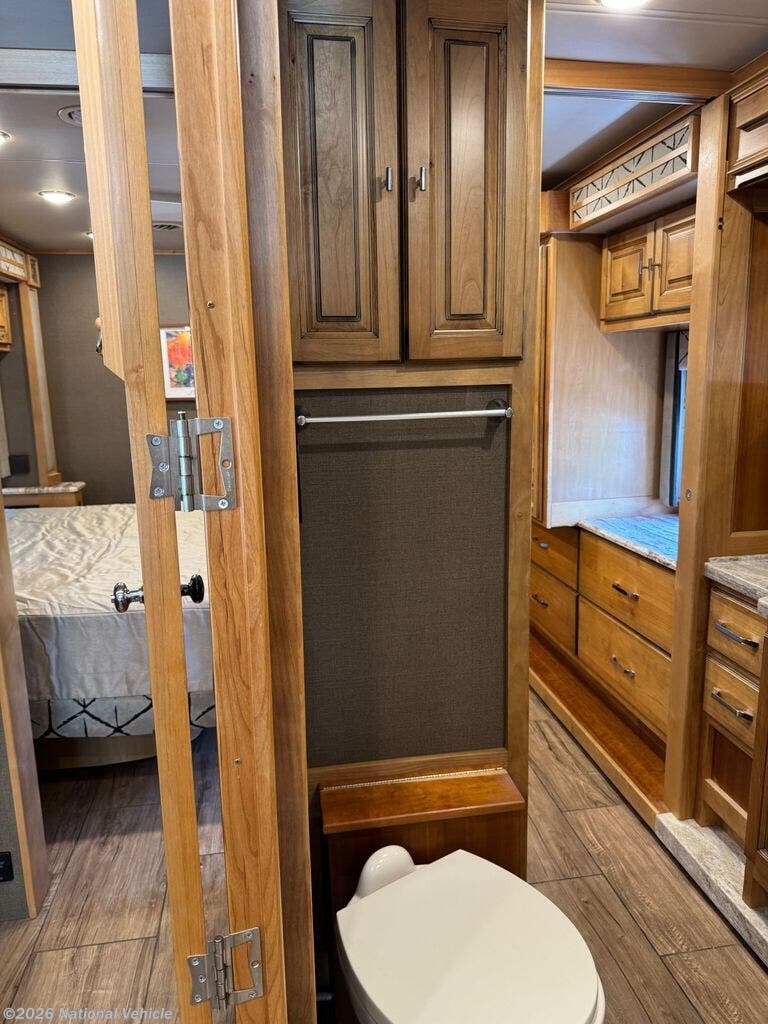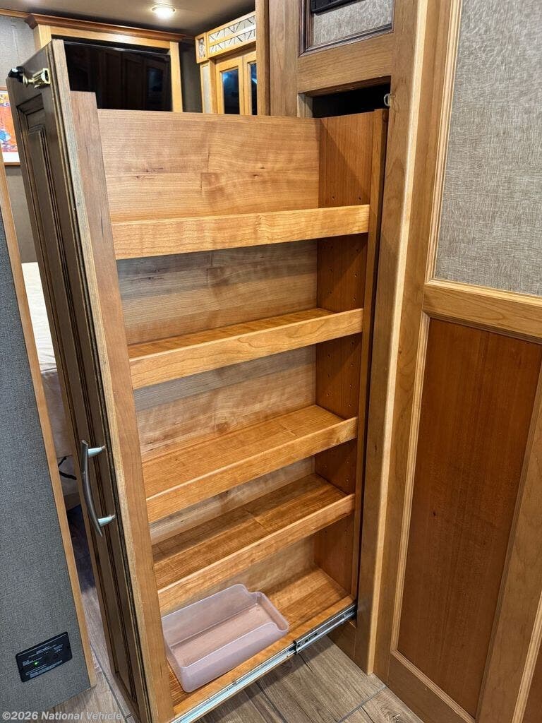 The kitchen is both functional and stylish, offering a gas cooktop, convection microwave, and a large residential-style refrigerator with double doors and a bottom freezer. There?s no traditional oven, allowing for more streamlined storage and usability. High-end finishes continue with heavy-duty luxury vinyl flooring throughout and Tiffin?s signature handcrafted cabinetry, known for its durability and timeless appeal.