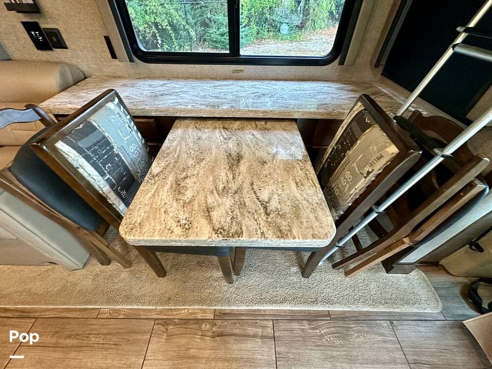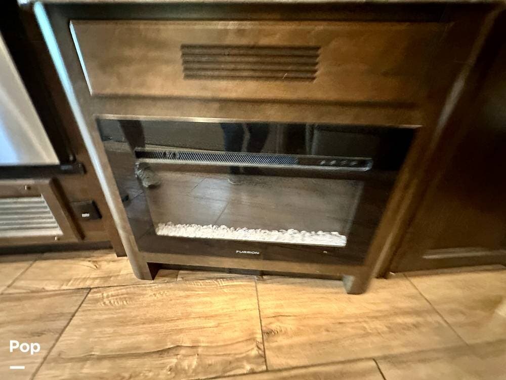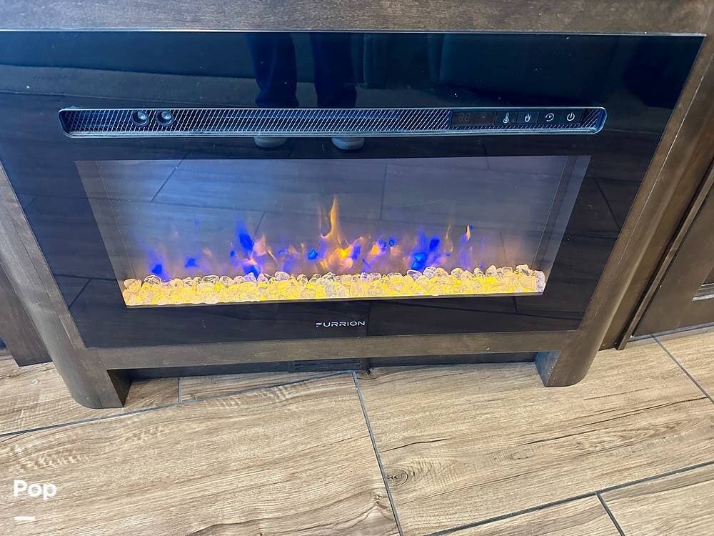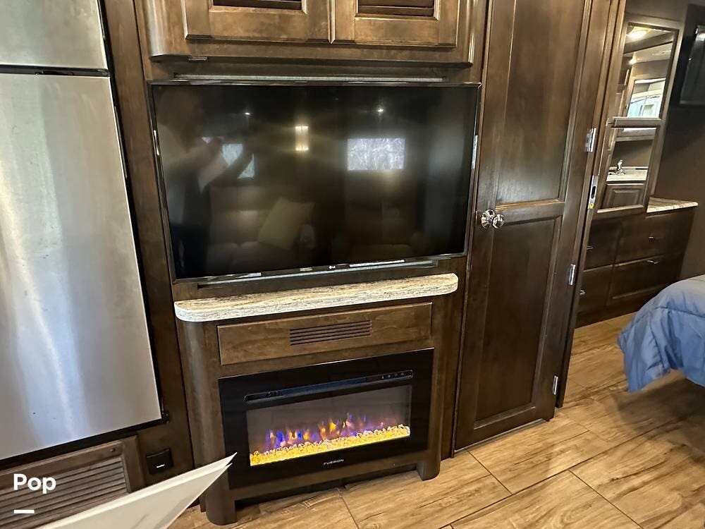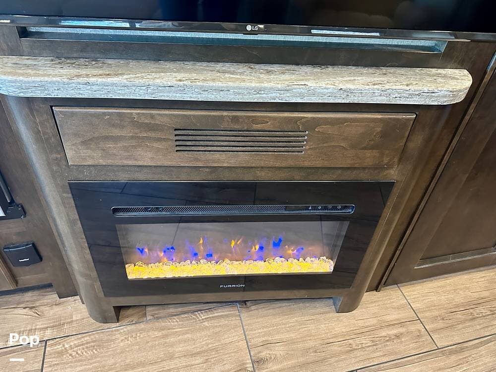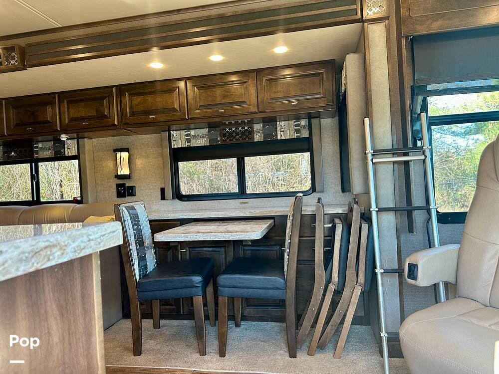 Inside, the design is elegant and inviting. The living area opens wide with rich finishes and warm lighting that make it easy to relax after a long drive. A comfortable recliner and a sofa with a hide-away queen air mattress create a space perfect for conversation or quiet evenings in front of the fireplace. Two Smart TVs, surround sound, and a spacious dining area that seats up to four make this coach as functional as it is beautiful.