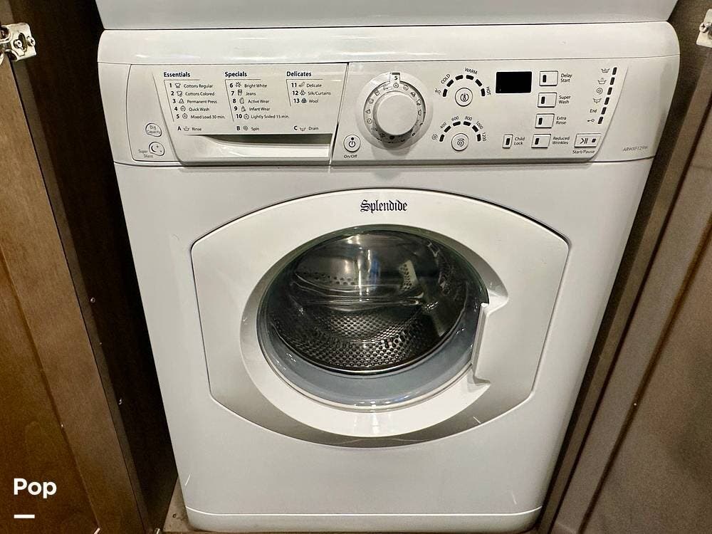 The bedroom offers a peaceful retreat, complete with a queen-size bed, Smart TV, ceiling fan, and generous storage. A private full bath sits just beyond, featuring a washer and dryer for extended travel convenience.