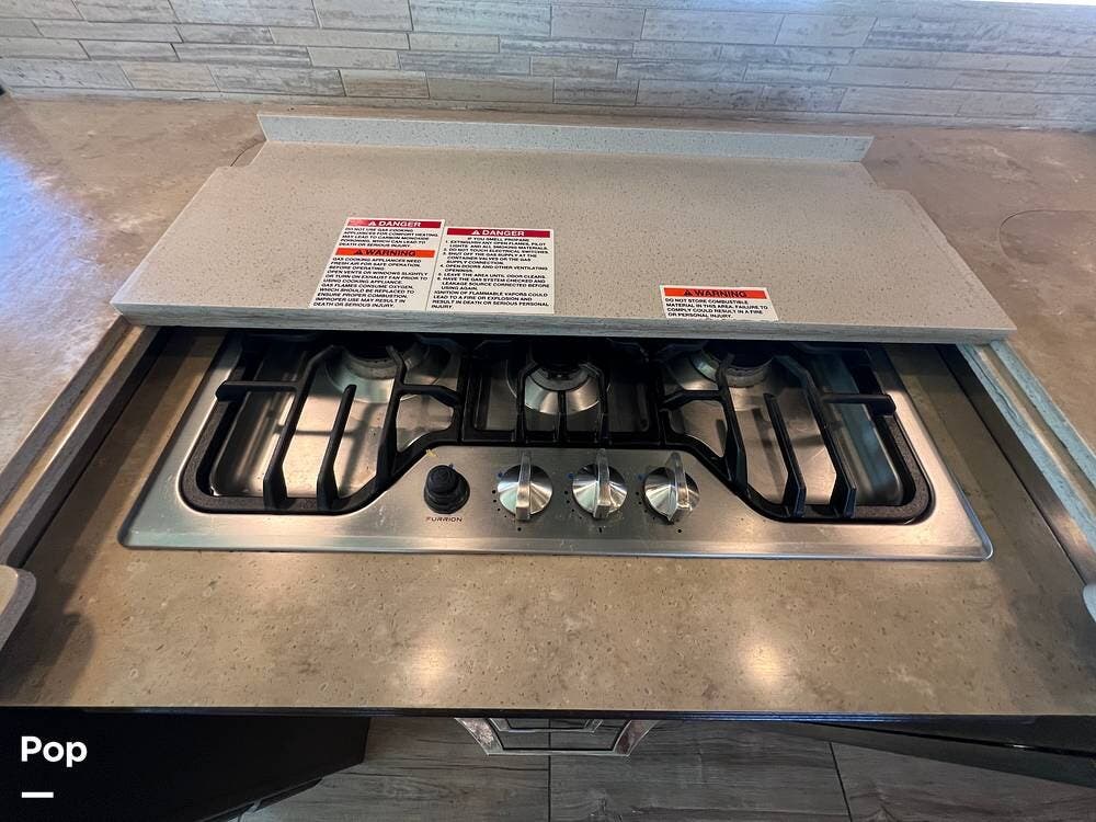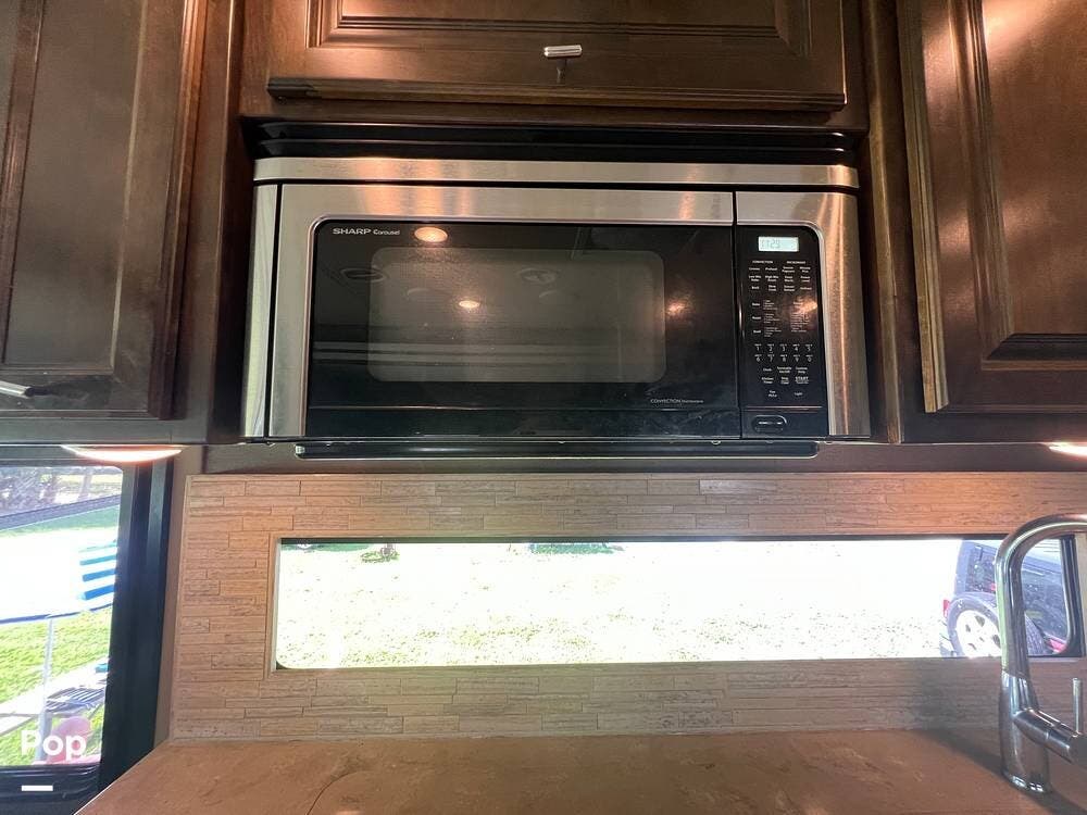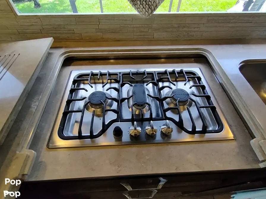 The kitchen has everything you need to prepare your favorite meals while away from home. It includes a triple-burner gas stove and a convection microwave. You will also love the new roomy stainless steel refrigerator/freezer and the large double stainless steel sink with a pull-out spray faucet for easy cleaning.