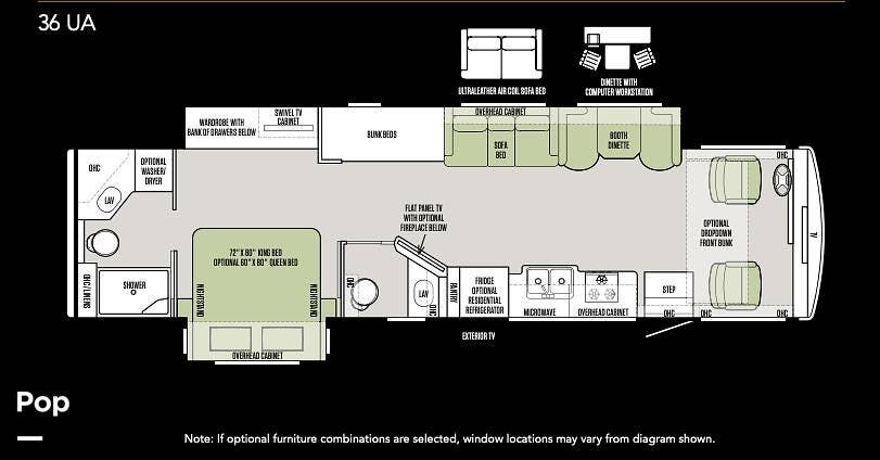 This coach is designed for your comfort and convenience. Its spacious interior, including a fireplace, provides a warm and inviting atmosphere, making you feel right at home. With ample storage space inside and out and well-designed living areas, you can bring all your essentials without sacrificing comfort or functionality.