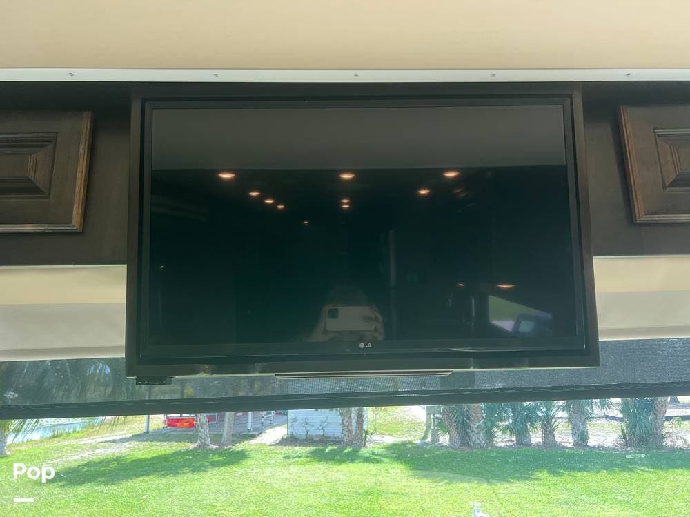 Outside is a large patio awning and an exterior TV for additional entertainment.